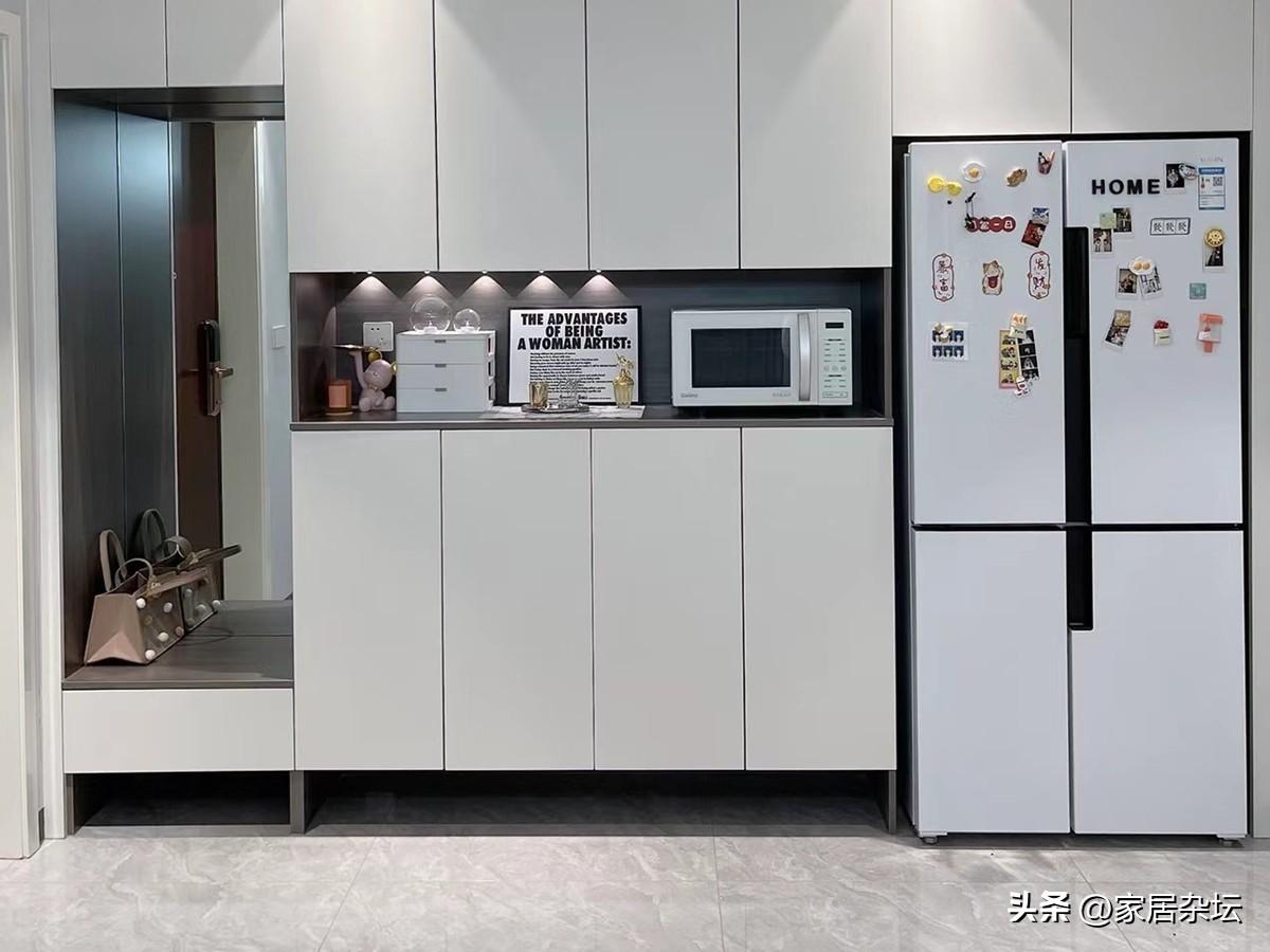 玄關側面放冰箱。這是比較適合的方案。側面打造成玄關櫃,玄關櫃的一側,就可以用來放置冰箱。