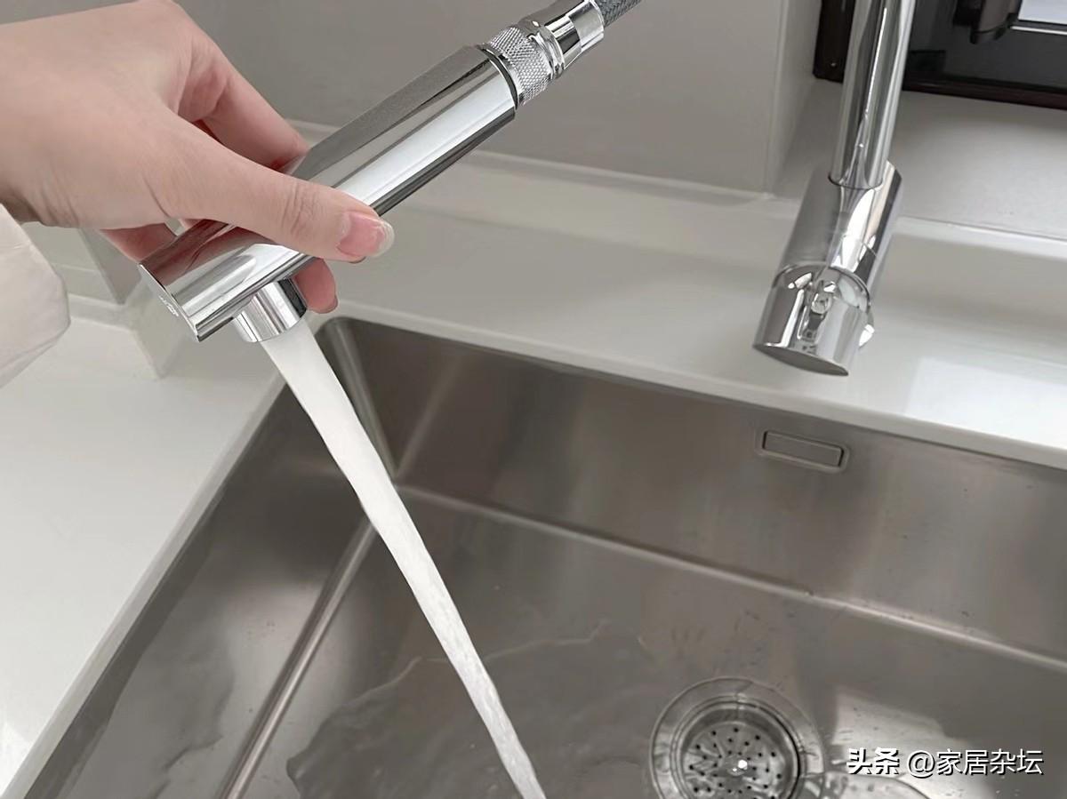 配抽拉水龍頭,作用也很強大。因爲我們的水槽用完以後,可能周圍就髒了。把水龍頭抽拉出來,一衝就乾淨了。