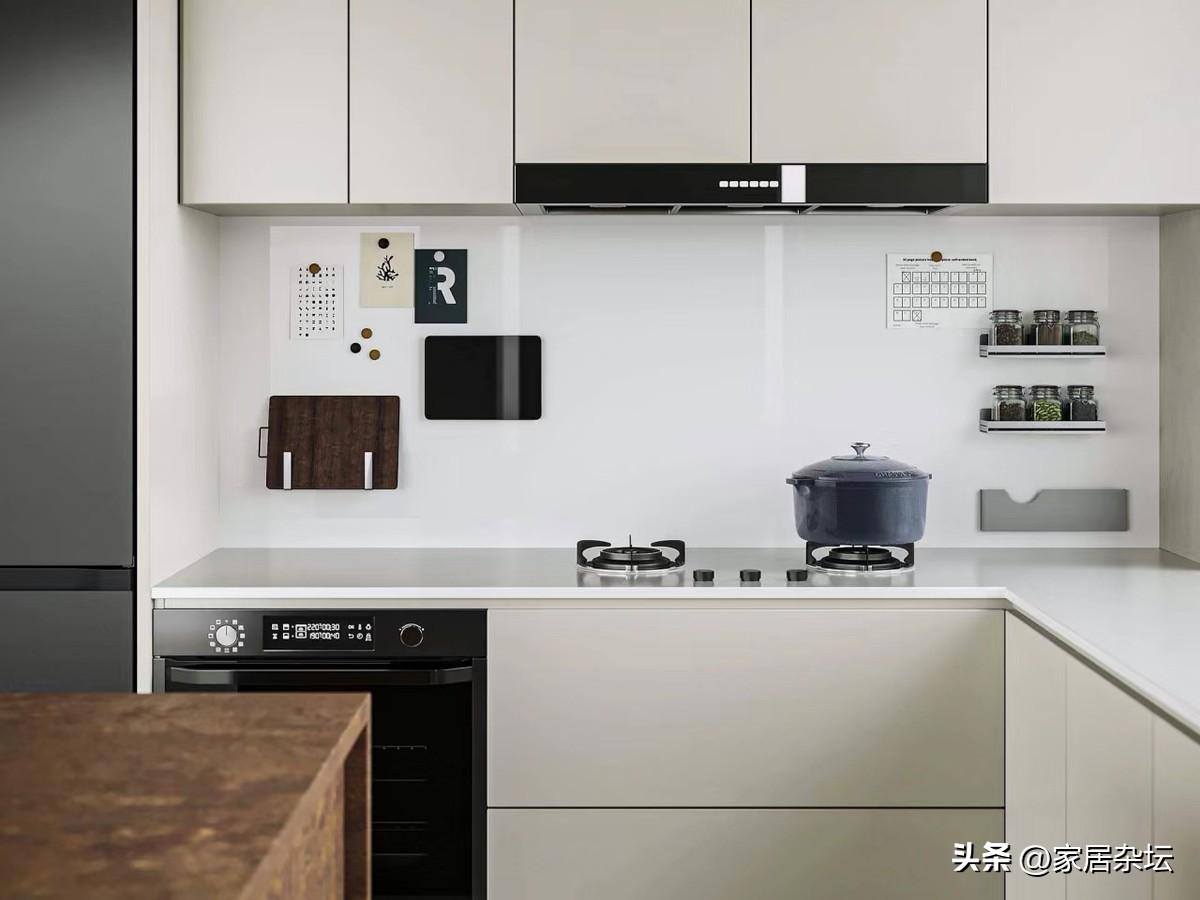 廚房牆面安裝琺琅板,不僅可以用磁吸置物架來收納廚房的零碎物品,而且牆面更耐污。平時,用抹布帶一下就很乾淨,不存在衛生死角。