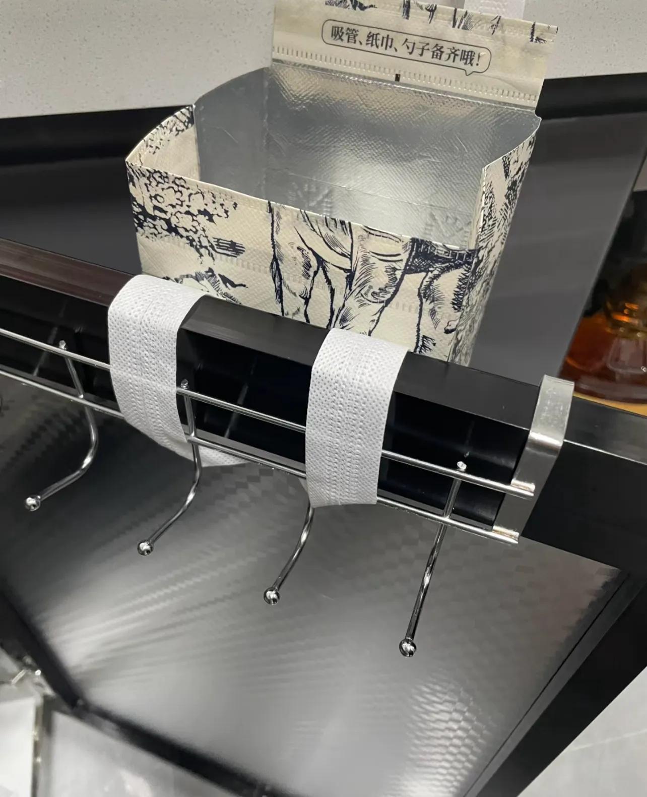 櫥櫃內,本來就有一組掛鉤,直接將奶茶袋,掛在掛鉤上,奶茶袋就變成了一個櫥櫃垃圾桶。