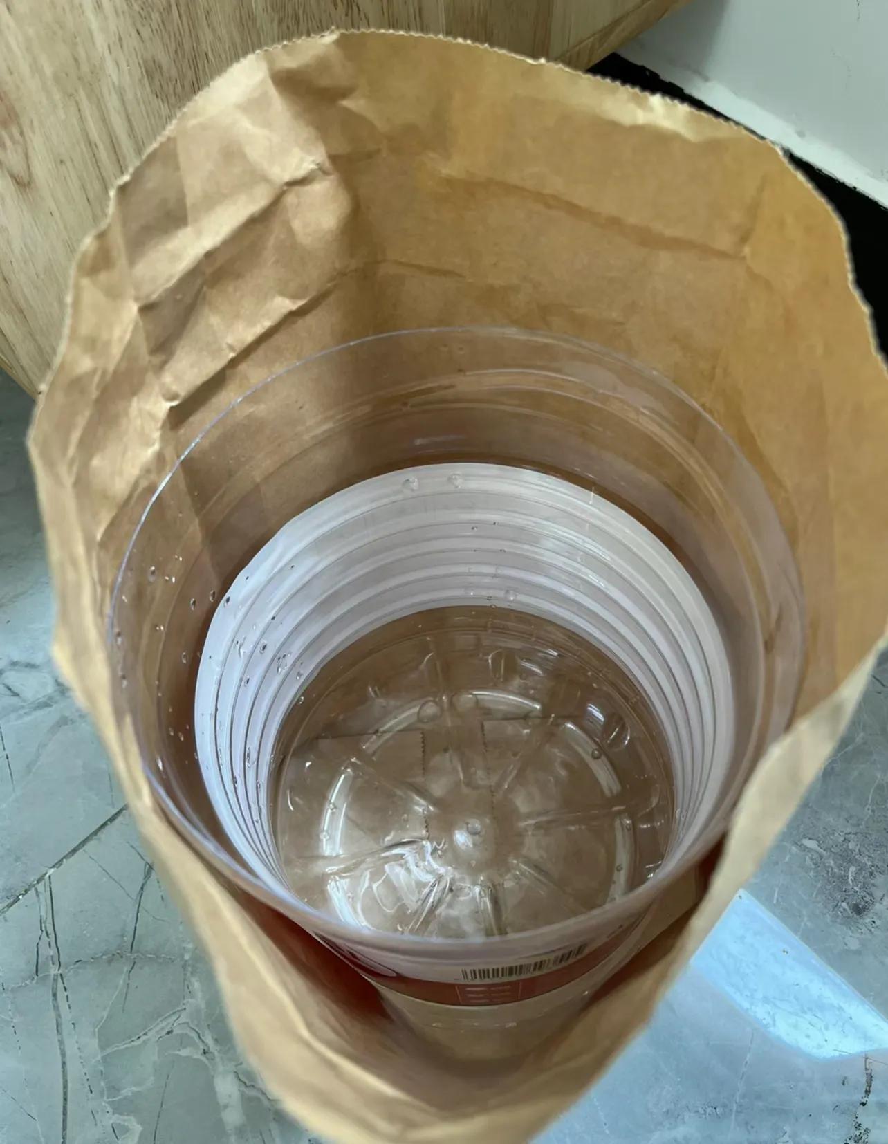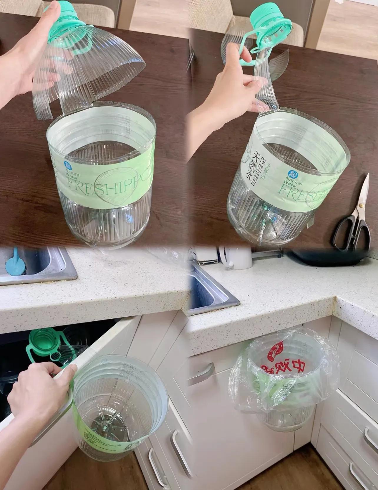 讓礦泉水桶與蓋子藕斷絲連,然後再把蓋子塞進櫃門內,就能收穫一個可以掛在櫃門上的礦泉水瓶垃圾桶了。