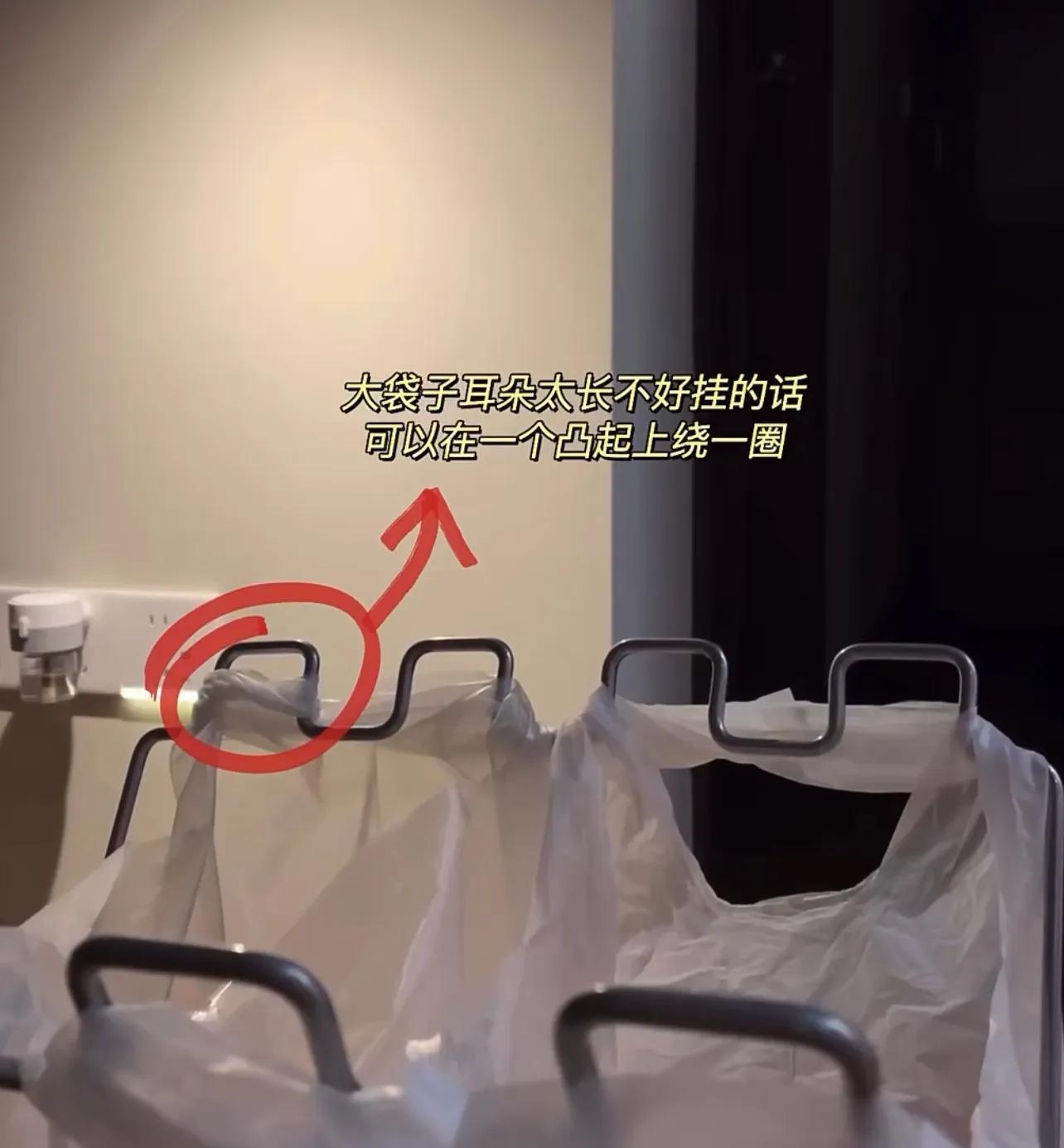 還不太挑垃圾袋,大的小的,垃圾袋我們都往上掛,有時候還掛兩個,分別裝乾溼垃圾。