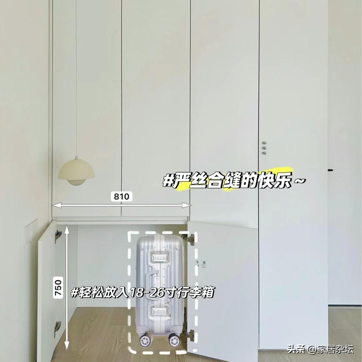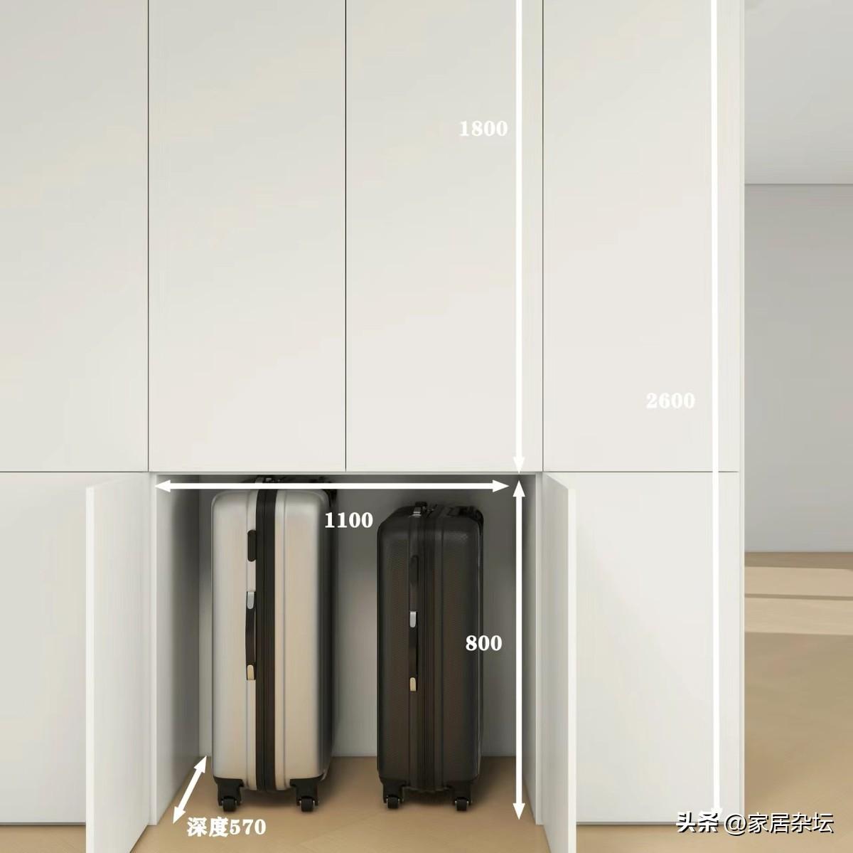 ③、方式選擇。行李箱櫃要選櫃子最下面,而且是櫃子底部空一格的做法,這樣行李箱可以直接推進去。