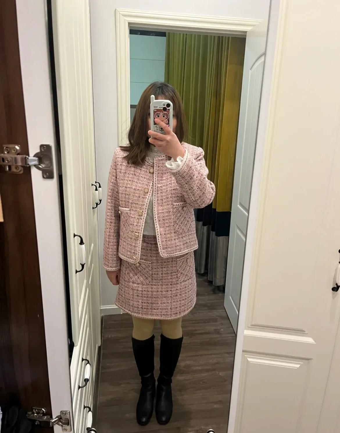 下來就是小香風自帶的精緻感,致使它非常挑穿着的條件和妝容,如果沒有化妝穿上她,會顯得非常土,而化了妝,日常通勤穿,又會顯得有點用力過猛;