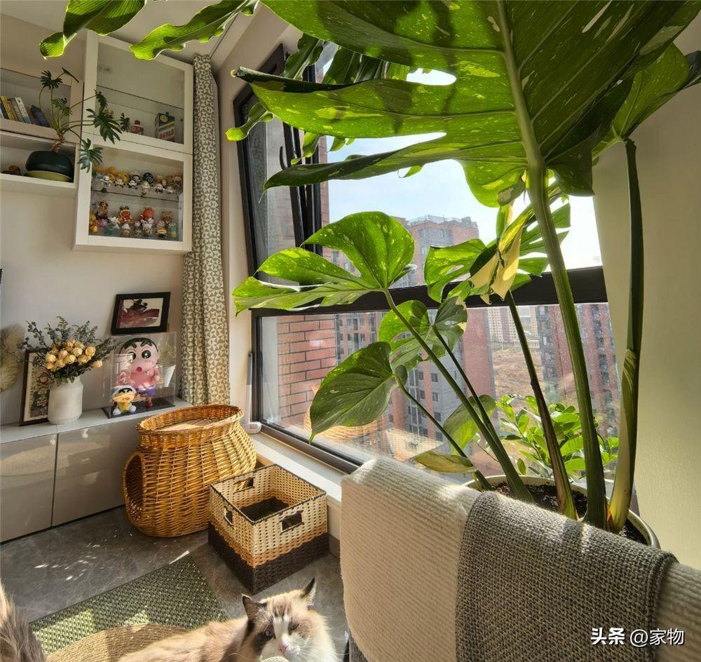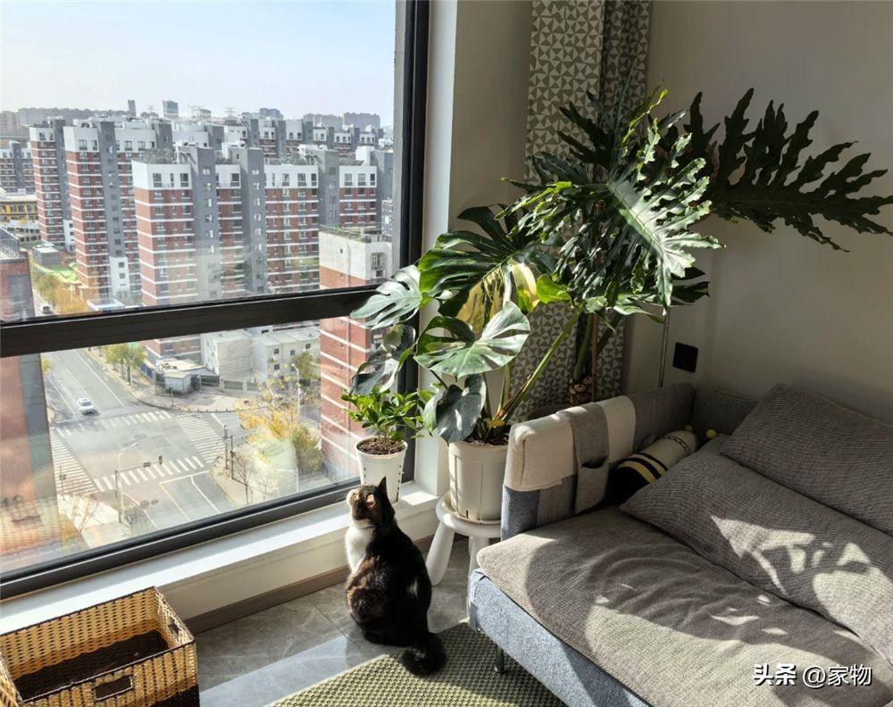 家裏沒有單獨的陽臺,但卻通過沙發旁邊靠窗位置的佈置,實現了陽臺的功能——大株綠植放到沙發旁邊,貓窩和貓砂盆也放在這裏,簡單一個窄窄的空間,利用卻十分合理。