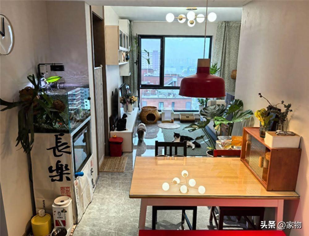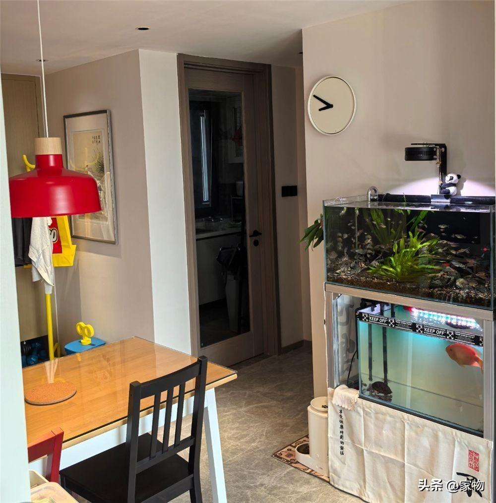家裏的餐桌空間很小,只放上了一張四人位的小桌子,旁邊就是家裏的兩層魚缸,魚缸底部用一道布簾進行遮擋,也可以收納各種雜物,並留出中間的過道動線。
