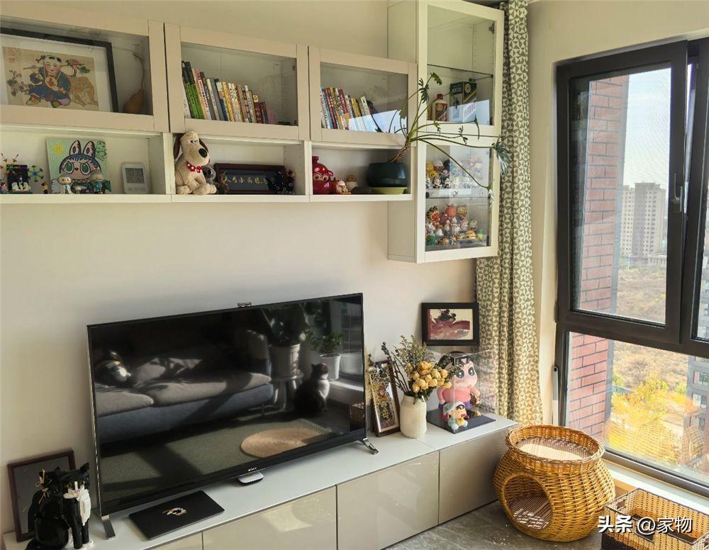 電視牆的位置,也以實用爲主,電視直接放在矮櫃上,頂部還做了一組玻璃門+開放式收納吊櫃,可以容納下各種各樣的擺件裝飾和雜物,提升了家裏的收納空間,讓小客廳顯得格外整潔乾淨。