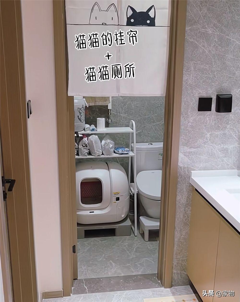 而裏面的衛生間要更小一些,以至於沒辦法再隔斷浴室,不過也有完整的如廁區,並放下了貓砂盆,旁邊還用架子架高,利用縱向空間進行收納,不浪費每一寸空間。