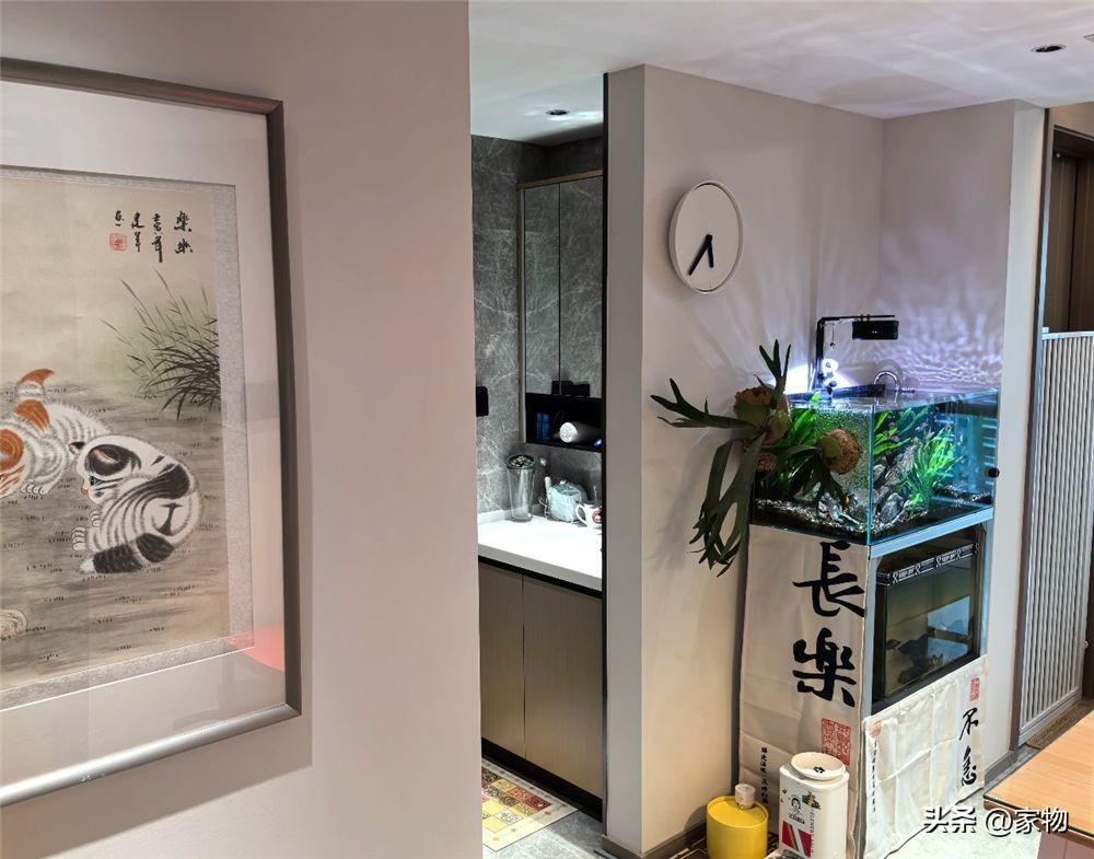 家裏的小衛生間,做成了乾溼分離的格局,洗手檯就在剛纔說過的魚缸櫃的後面,用一道窄牆進行分隔。