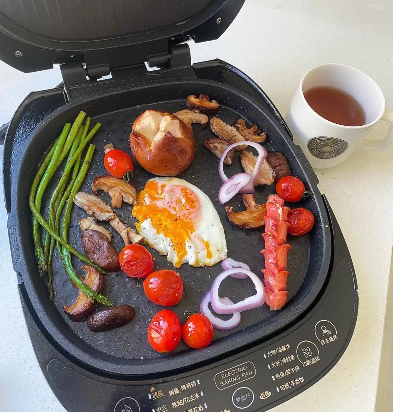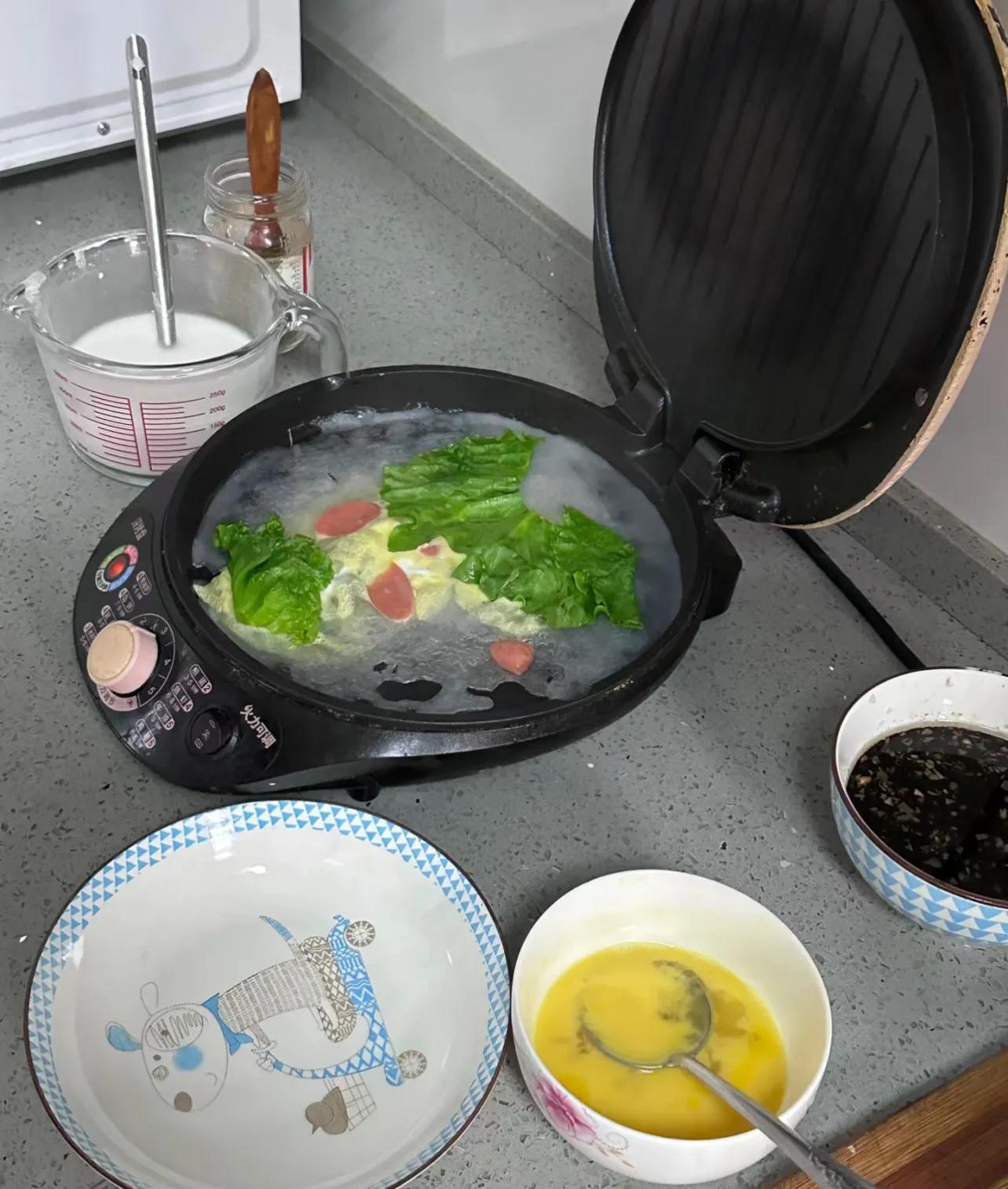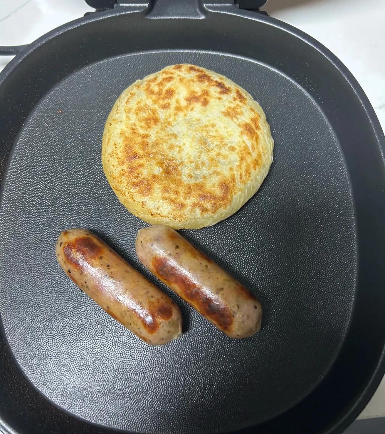 於是乎,甭管是碳水是手抓餅還是饅頭,蛋白質是肉腸還是雞蛋,只要是放到電餅鐺裏,咱都可以一鍋出。