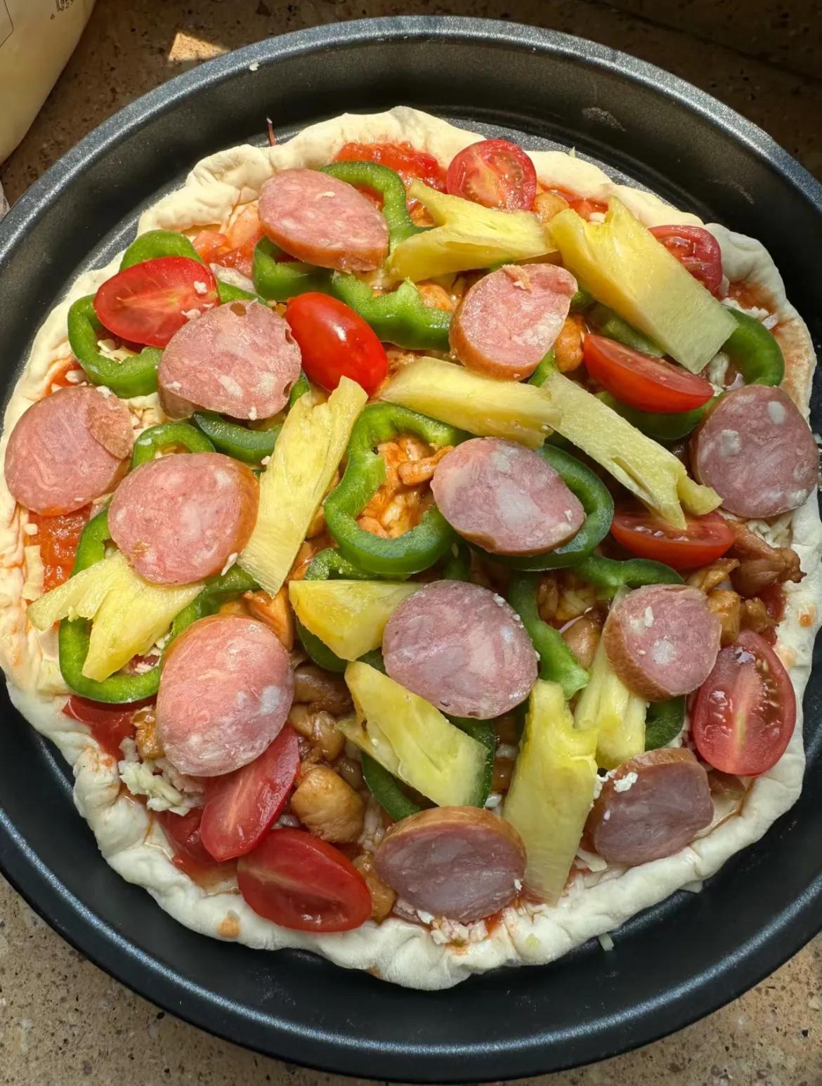 第二層輔料層:其實也就是配料豐富的過程,菠蘿、火腿、玉米粒、蝦仁,喜歡什麼食材加什麼食材;