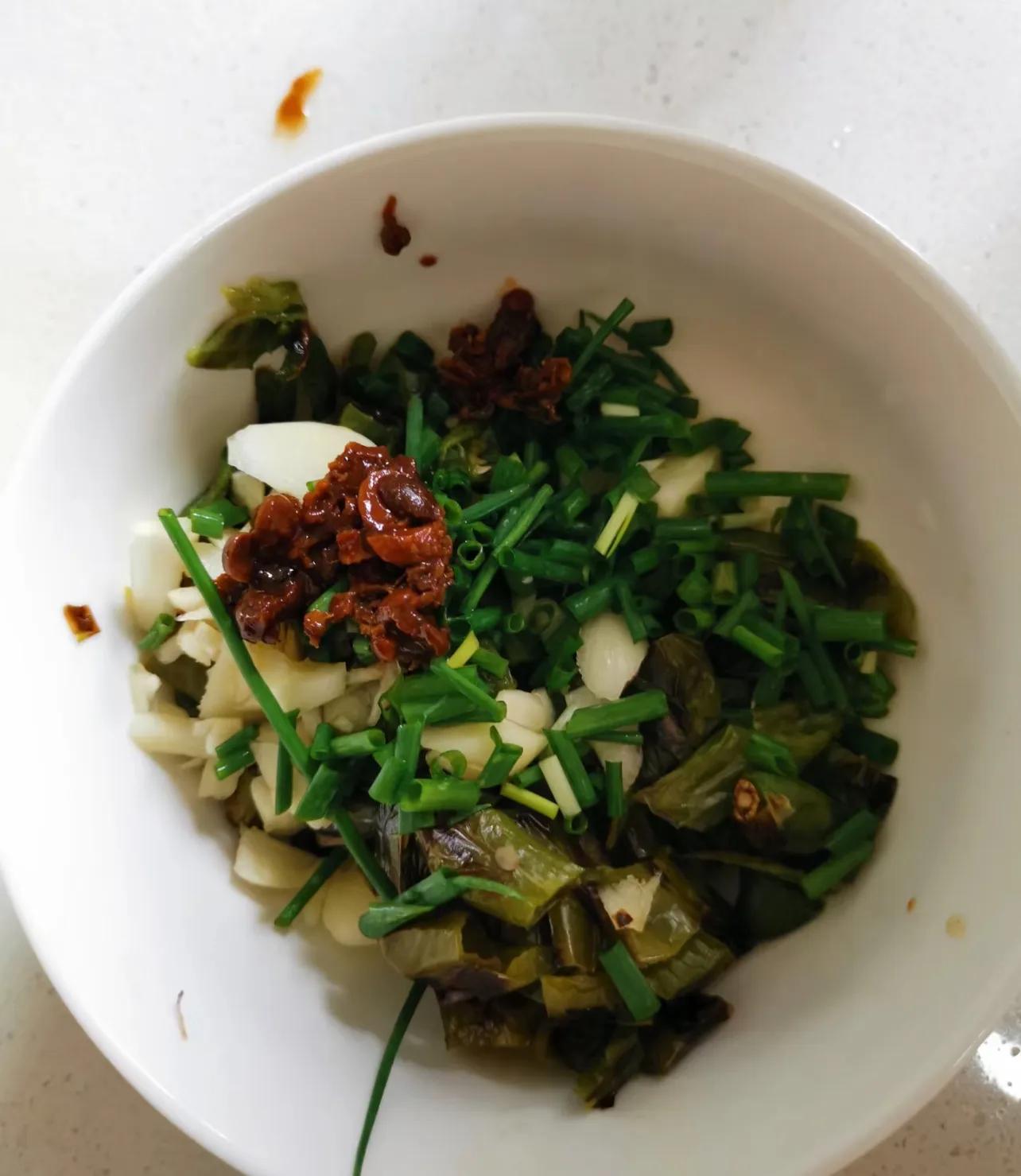 買一盒梅乾菜,加水泡軟之後,然後炒肉末梅乾菜,調料加生抽、鹽、胡椒粉,炒香香之後出來用麪糰先包包子再擀平,鋪到電餅鐺裏。