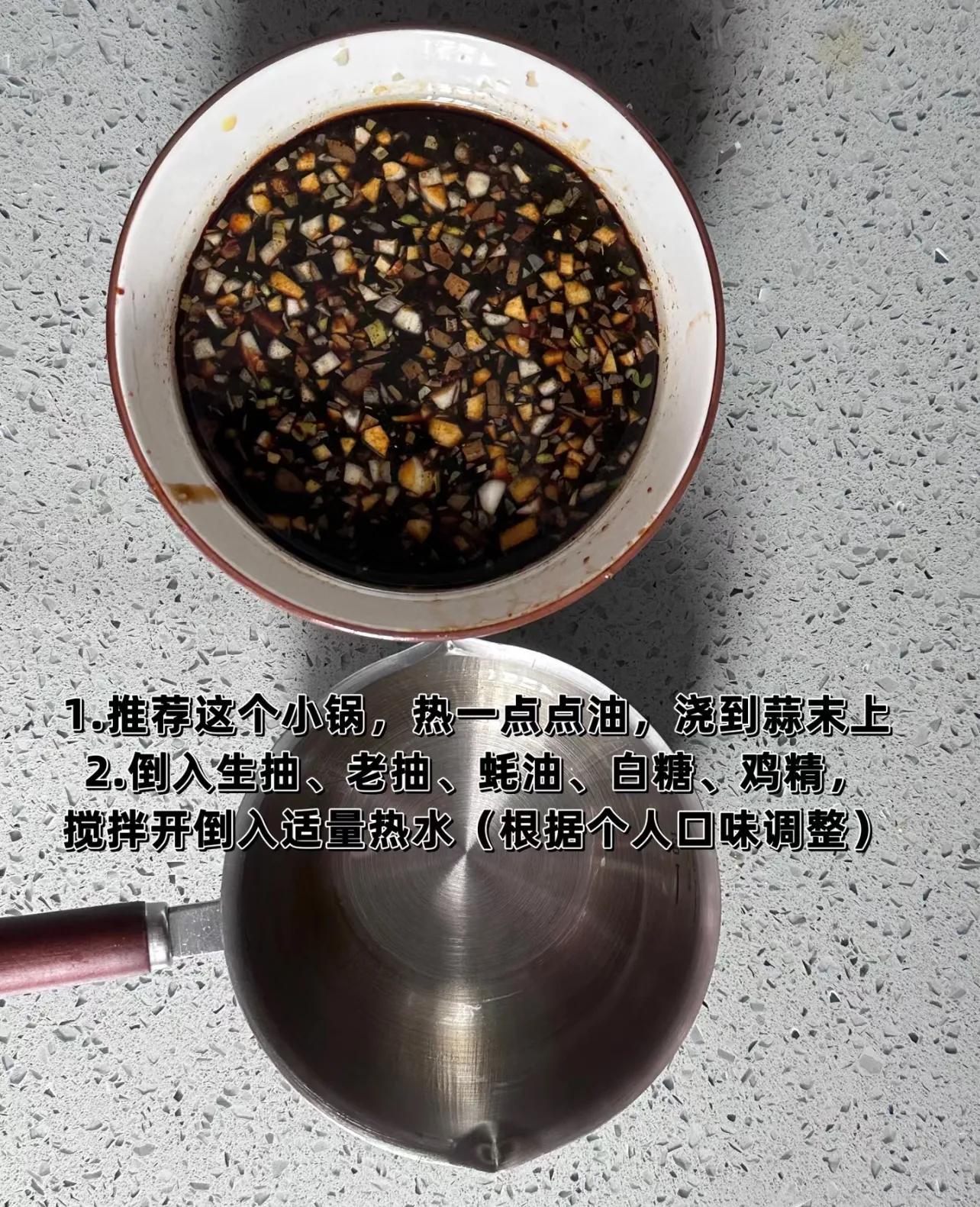 油潑蒜末後倒生抽、老抽、蠔油、白糖、雞精,因爲所有調料加一起,味道會有點重,所以最好再倒一丁點熱水稀釋,再淋到腸粉上,那一口下去,簡直完美!