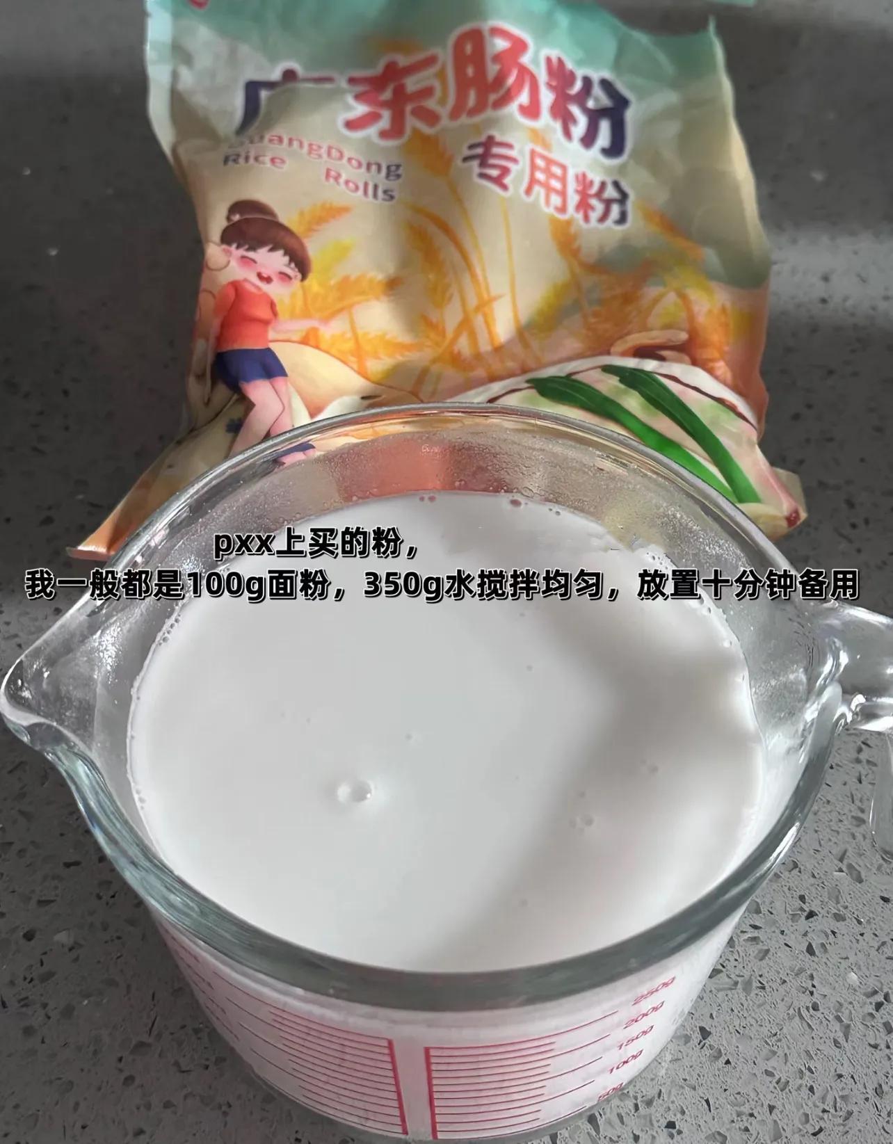 我一般都是100g腸粉粉,加350g水攪拌均勻。
