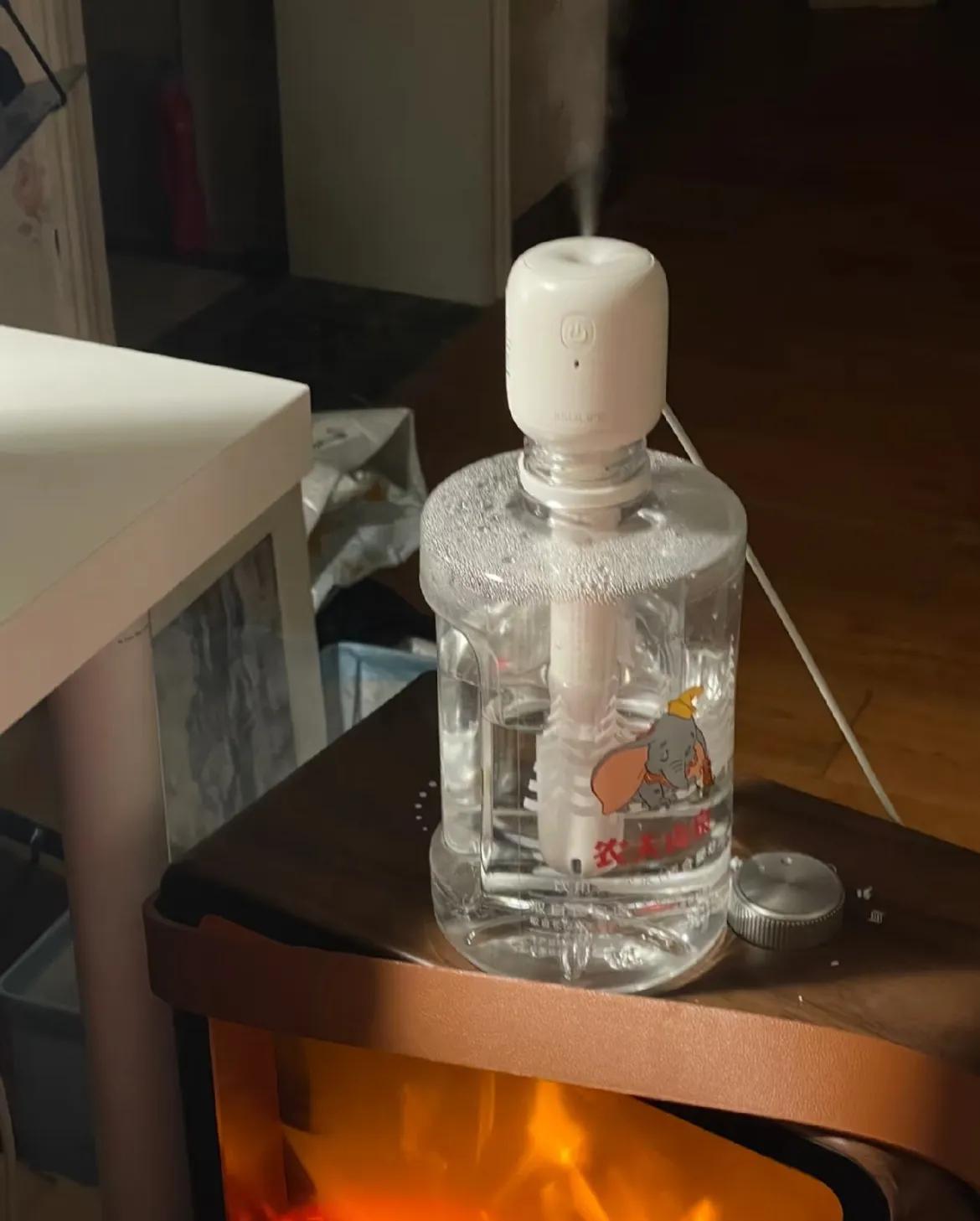 它就是一個加溼器的核心,只有出氣兒那一部分,可以直接插到礦泉水瓶上使用,這不就把加水、洗水箱的步驟省了麼?