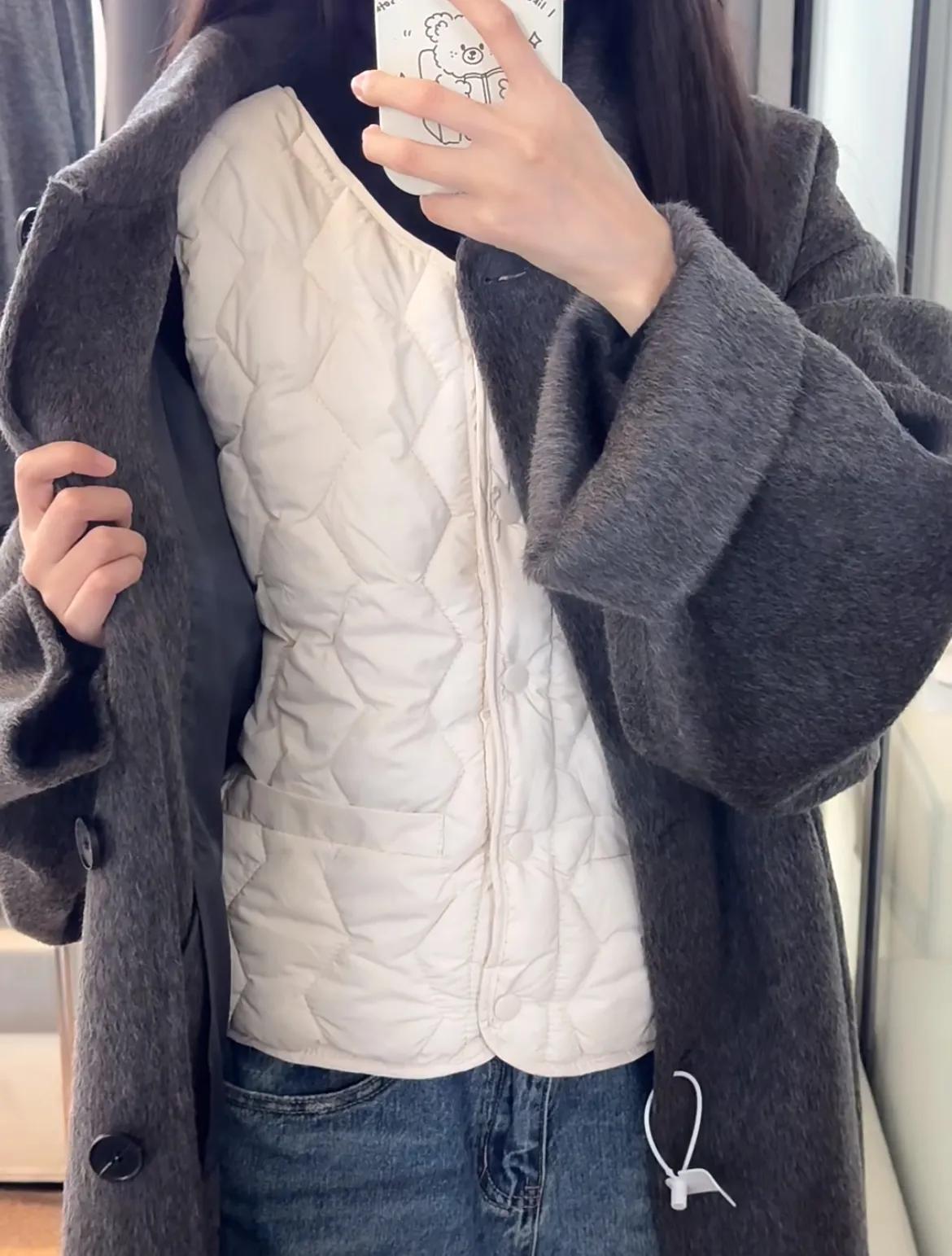第二個原因則是,奶白的顏色、配上洋氣的菱格,穿上既不會臃腫,又有疊搭效果,穿上就是個保暖又好看的時髦精。
