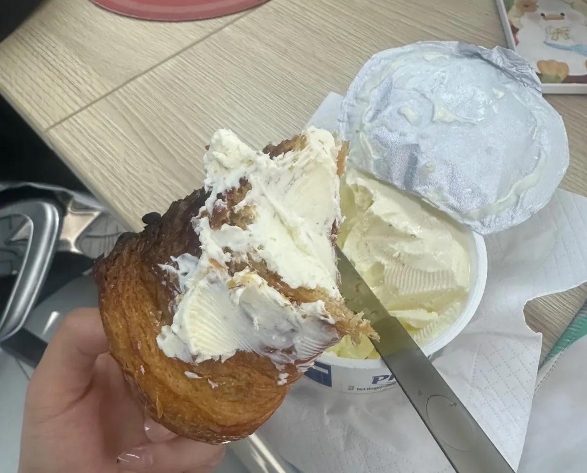 偶爾時間充足了,還會把麪包在空氣炸鍋裏烤兩分鐘再抹奶酪,喫起來脆脆的、奶奶的,一口下去簡直香迷糊了。