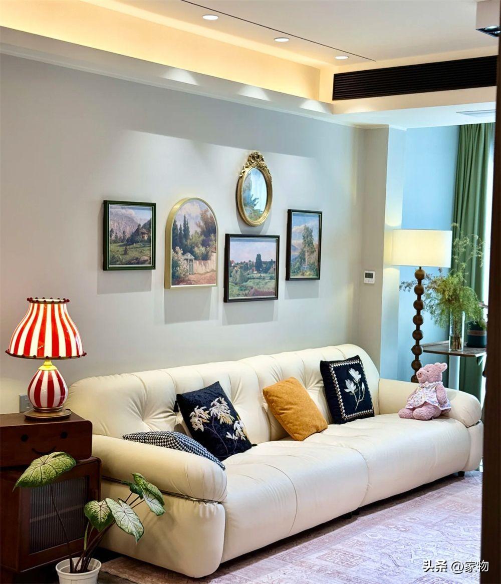 家裏的沙發區域很簡單,但卻有種古典的風格——淺色調的四人位沙發靠牆擺放,後面用一幅幅小框畫進行裝飾,讓平平無奇的沙發背景牆增添了幾分有趣的元素。