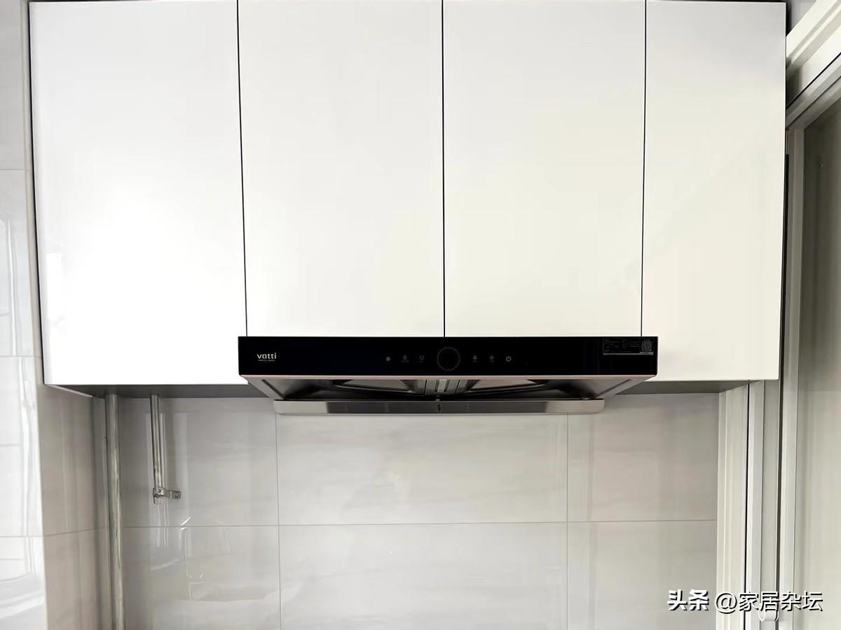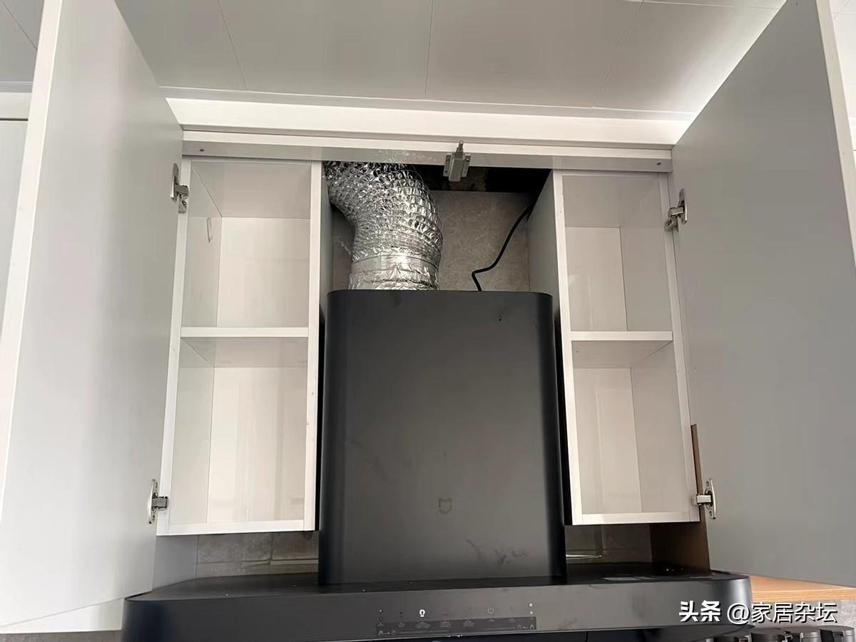 所以,現在所看到的很多油煙機裝修完的照片,就只能看到油煙機的顯示屏。而上部的整個罩子、管道,都是在櫃子裏的。