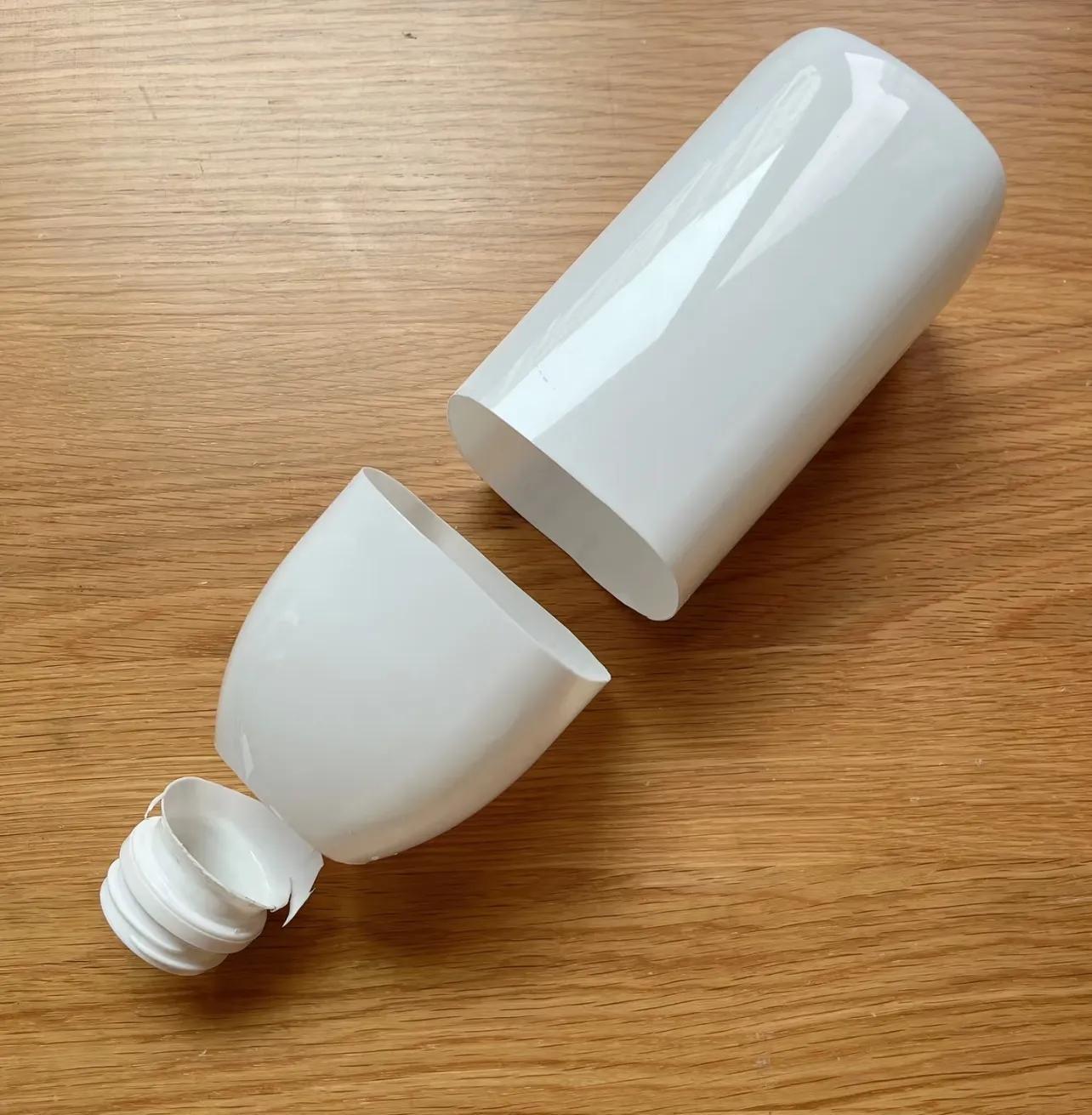 如下圖,從中間偏上開始有弧度的地方裁剪開,然後再剪掉瓶口;