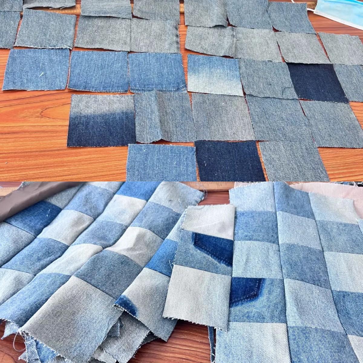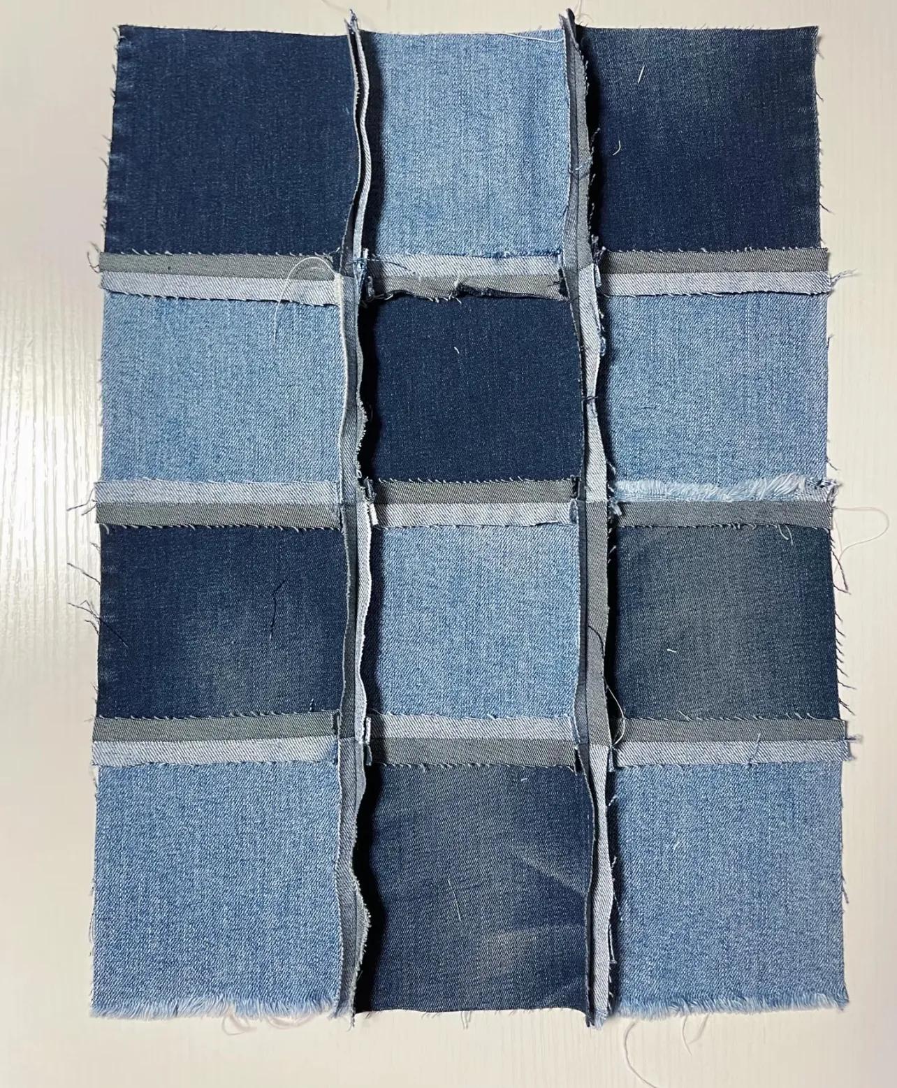 同樣是將牛仔布裁成小片,不同的是裁完之後的布料正反面搭配着放,然後還要刻意掏出毛邊,修剪整齊。