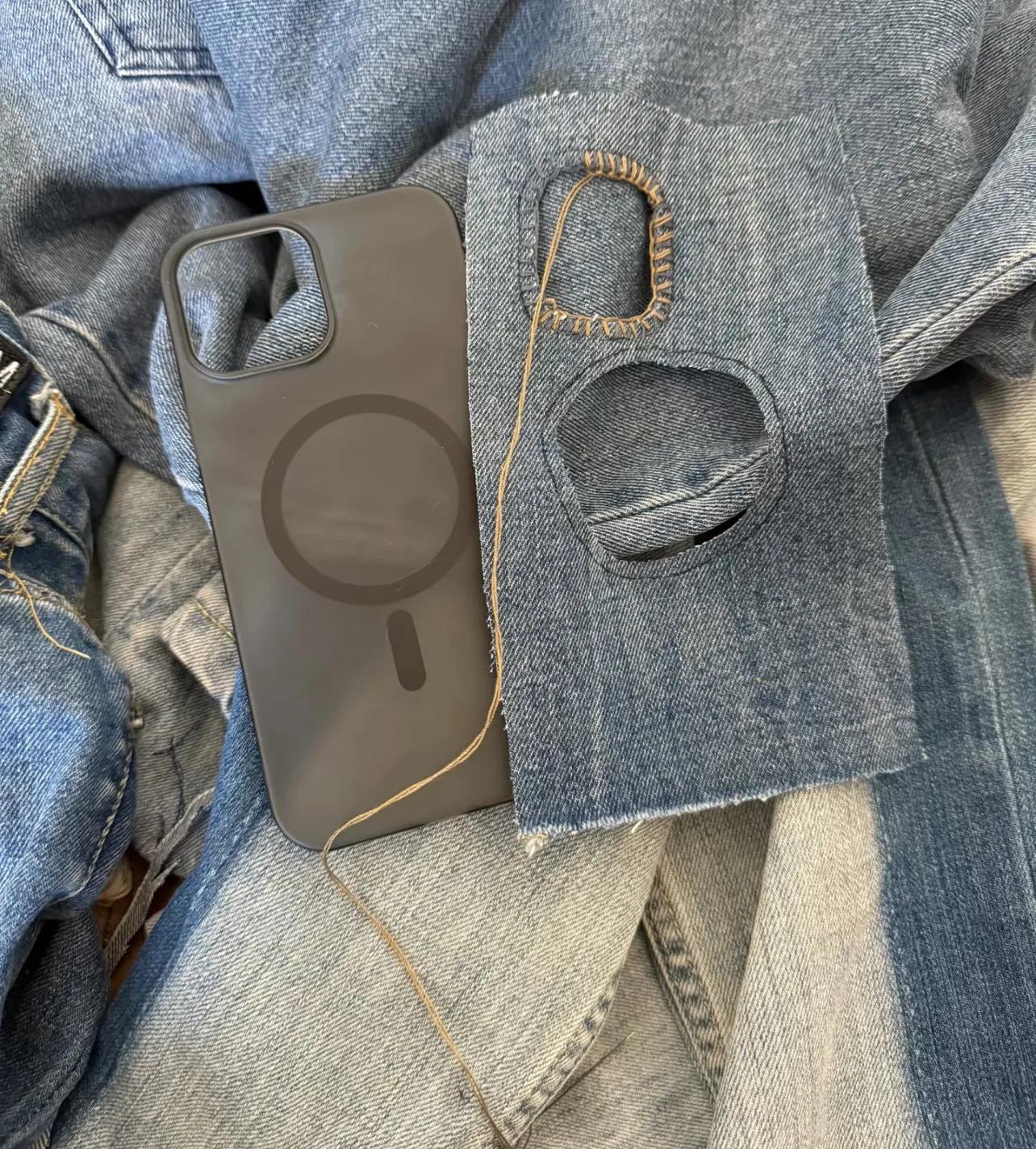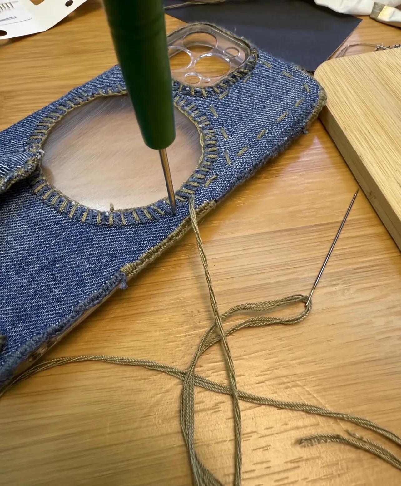也別怕自己的針腳粗糙上不了檯面,牛仔布料它就有這種凌亂氣質在,針腳越糙反而更協調好看。整體做好後,用膠粘在原本的舊手機殼上,就大功告成!