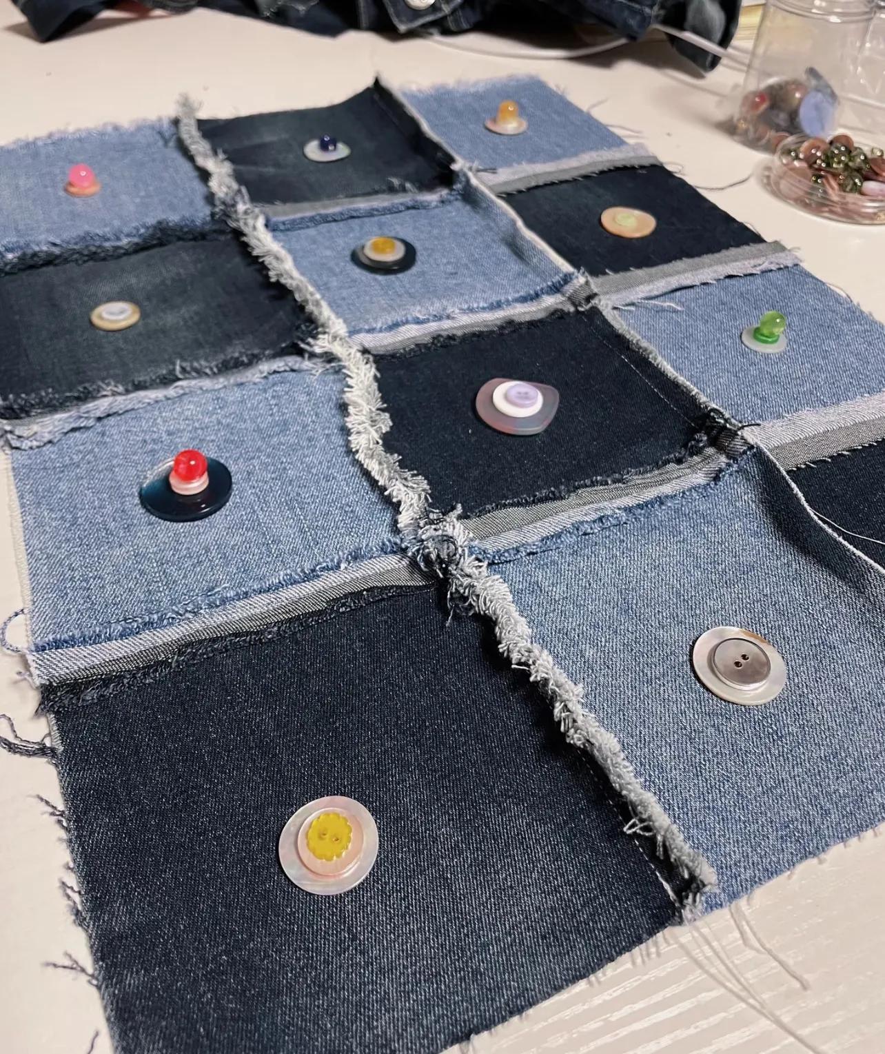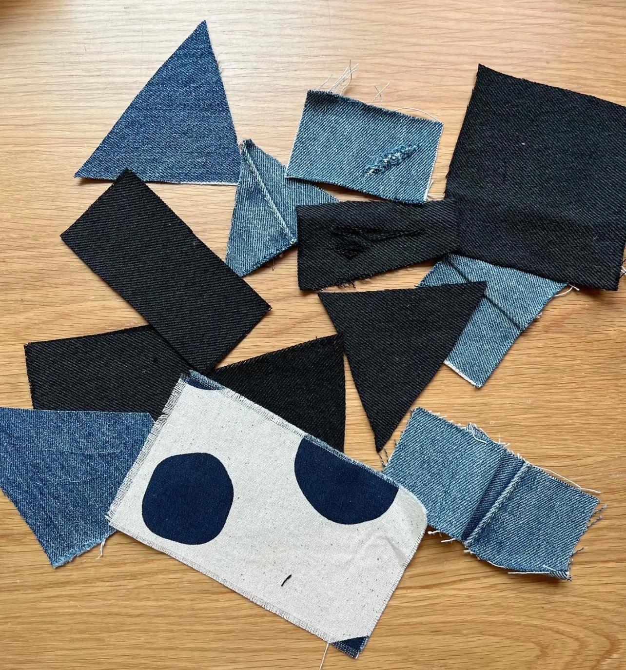 拿出廢棄的各種牛仔碎布片,顏色和形狀可以稍微多一點;