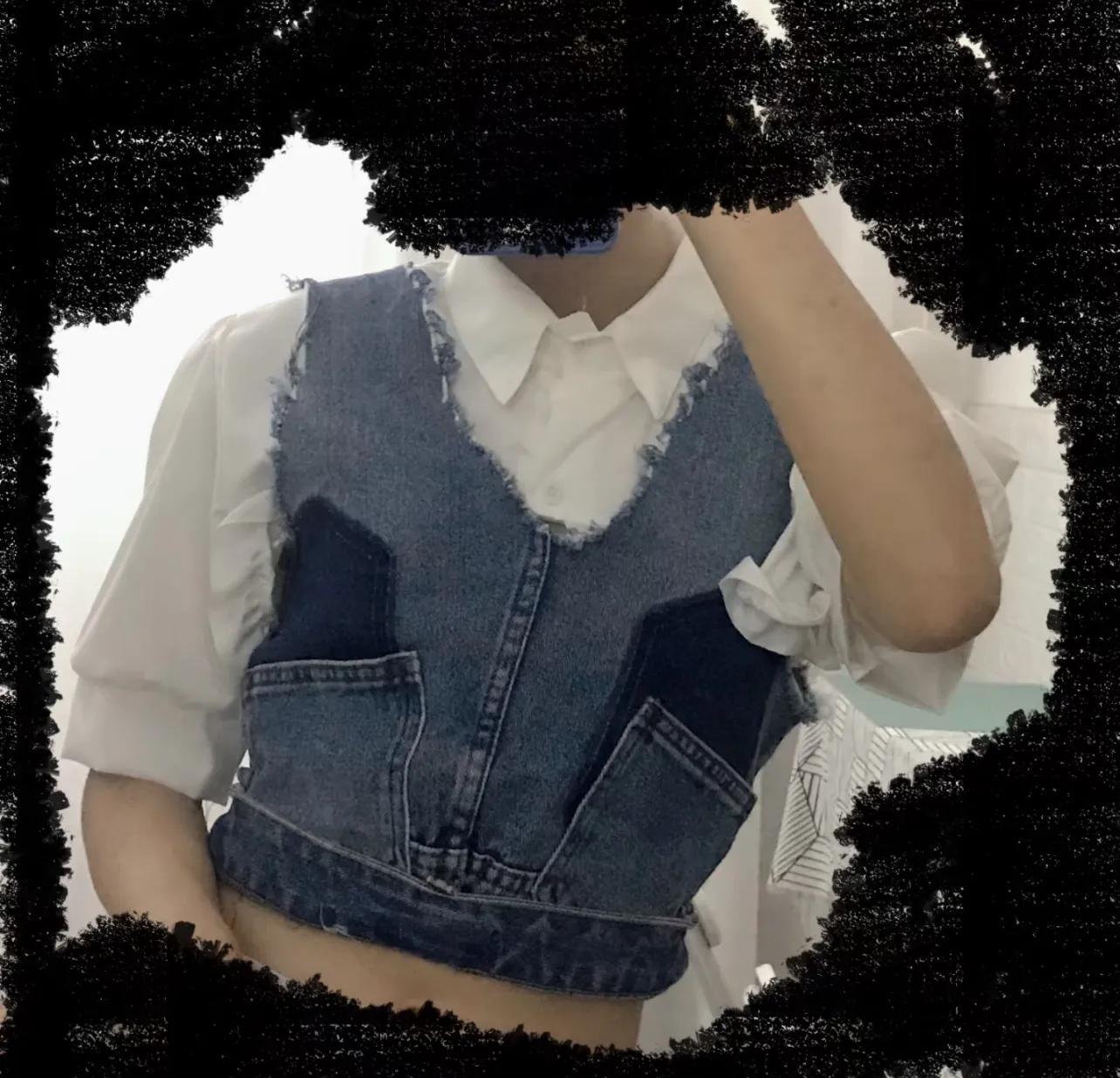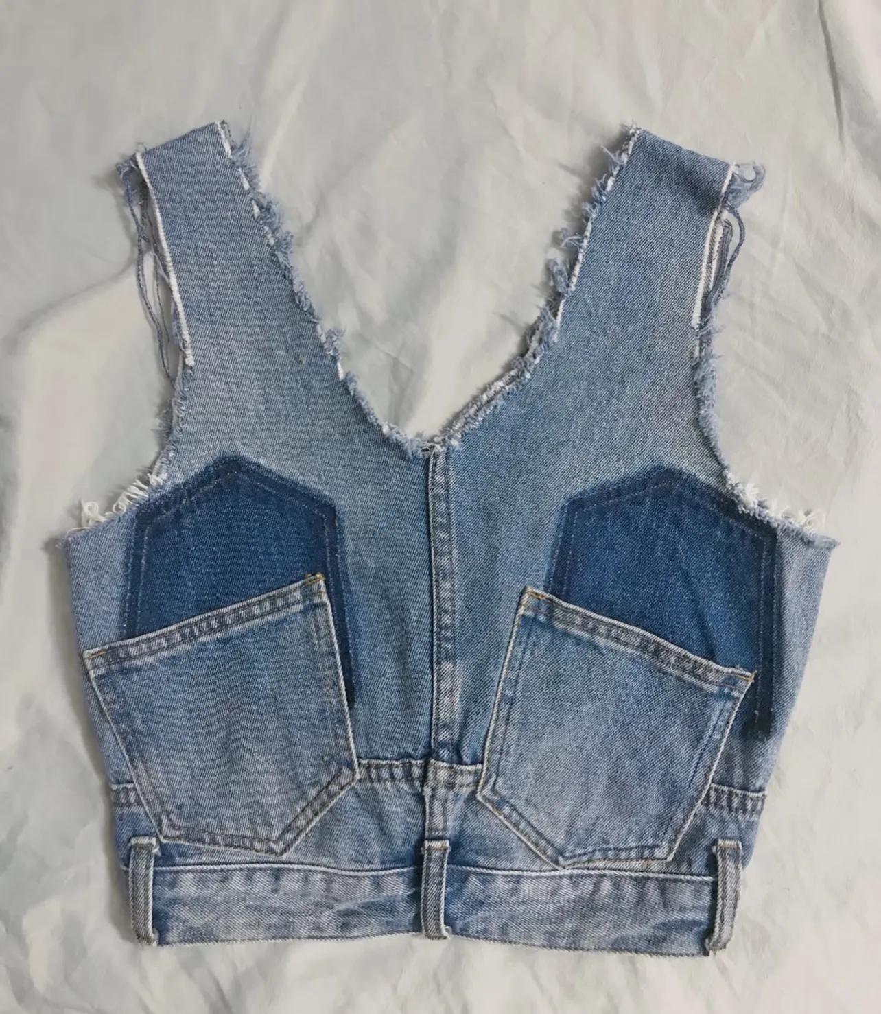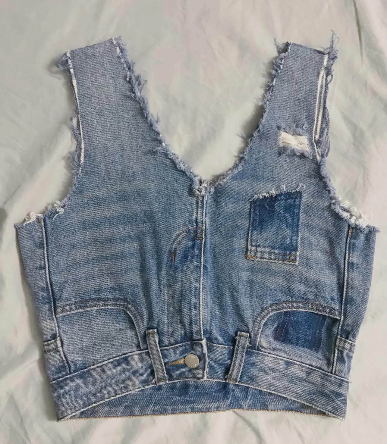 如上圖,把牛仔褲的上半截剪下來,褲腰處不用變,褲腿處剪成馬甲狀。
