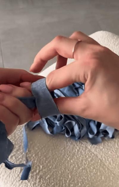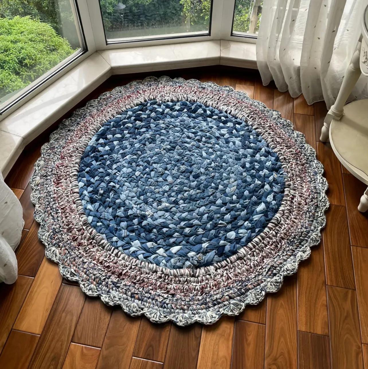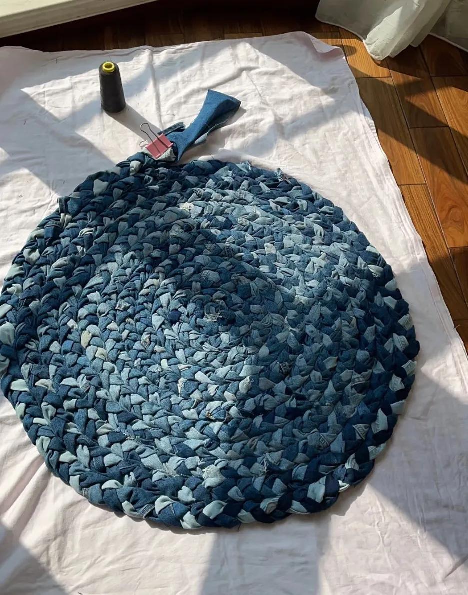 把廢棄牛仔褲剪成長條,然後跟打毛衣一樣,編織起來就好。