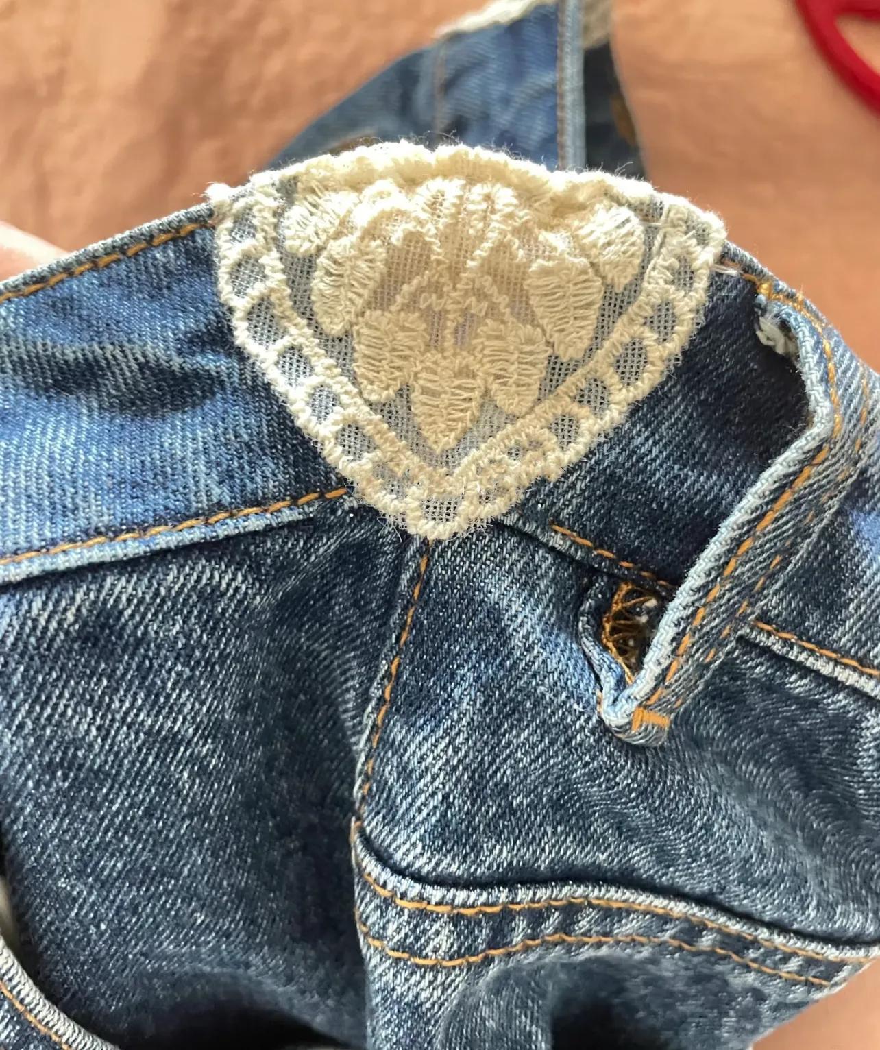 真的不用太動干戈,就在褲腰處剪一個口子,然後拽成三角形,拼接一塊好看的布料上去,比如蕾絲。