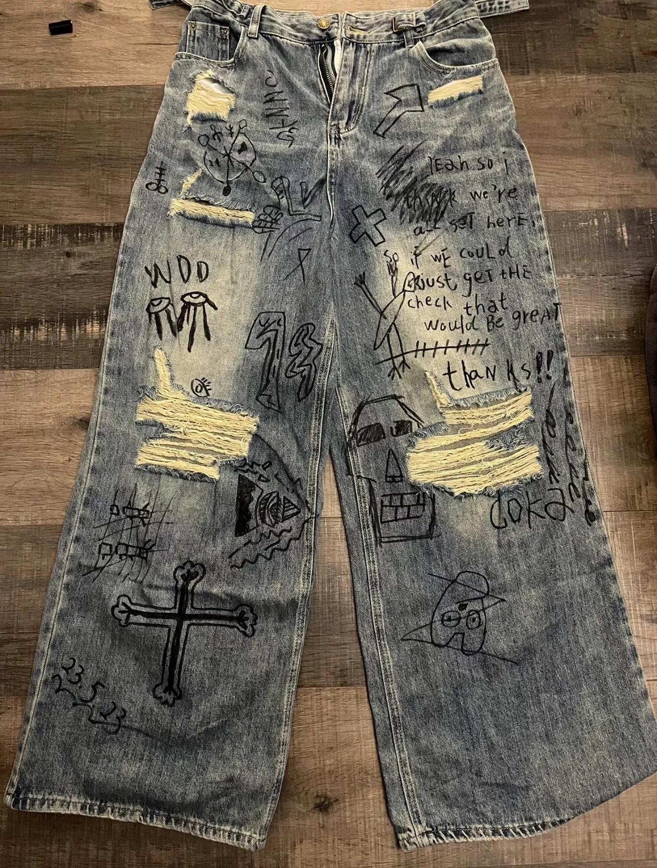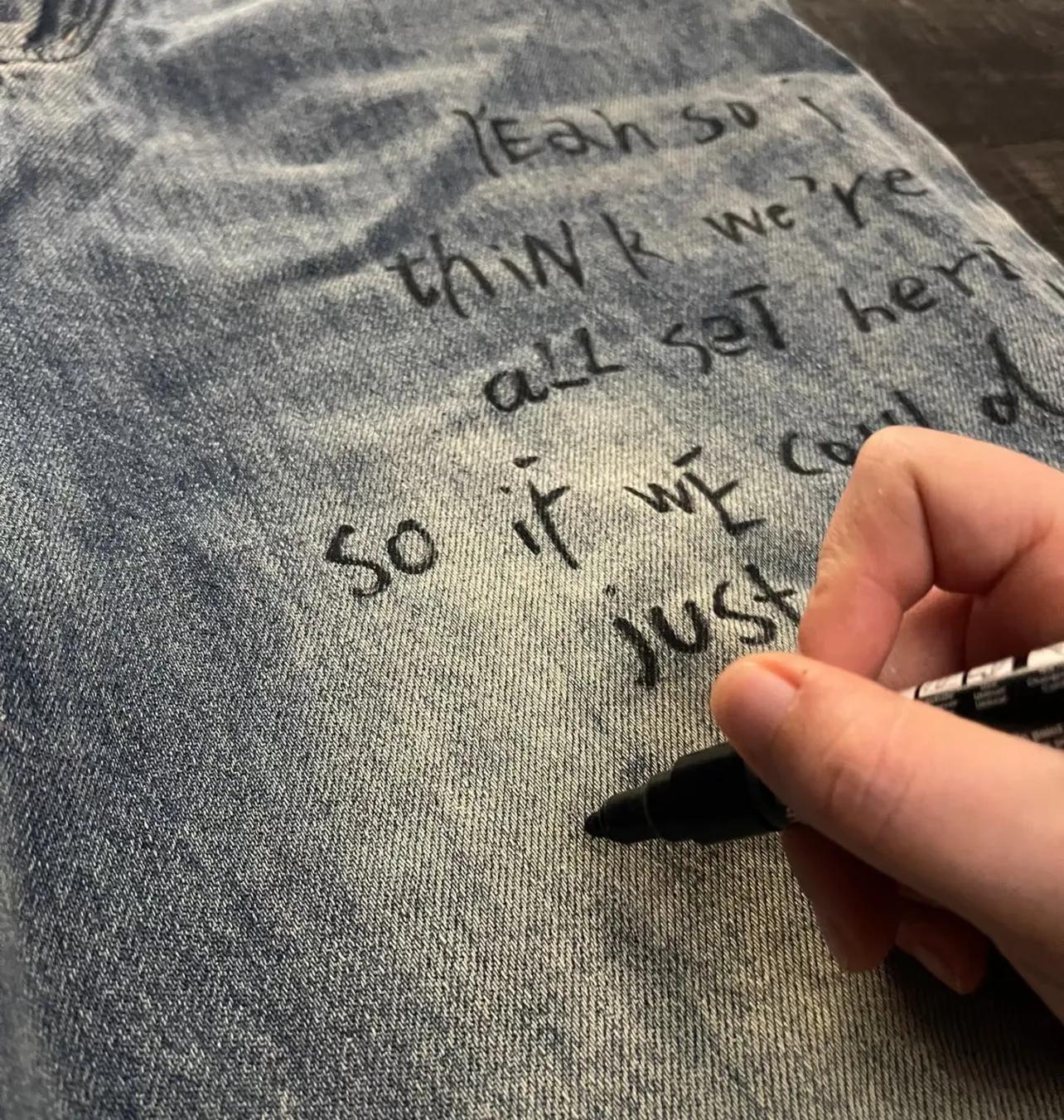 比如有個小哥哥網友,它的破洞牛仔褲不時興了,他乾脆就大膽亂造一番,直接用馬克筆在上面塗塗畫畫,沒想到畫完的褲子,一下子變得炫酷起來。
