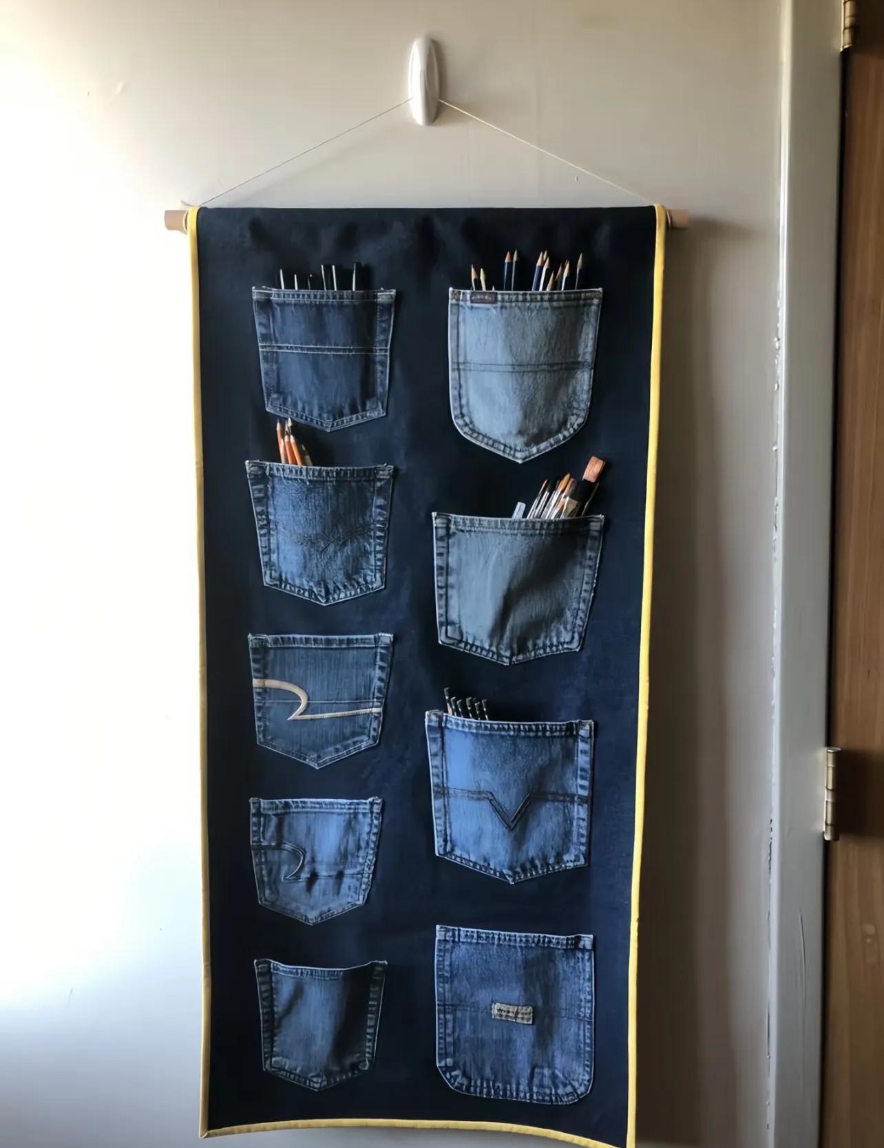 就普通的一塊布,廢棄牛仔褲多的,就直接把所有褲子口袋都拆下來縫上去;