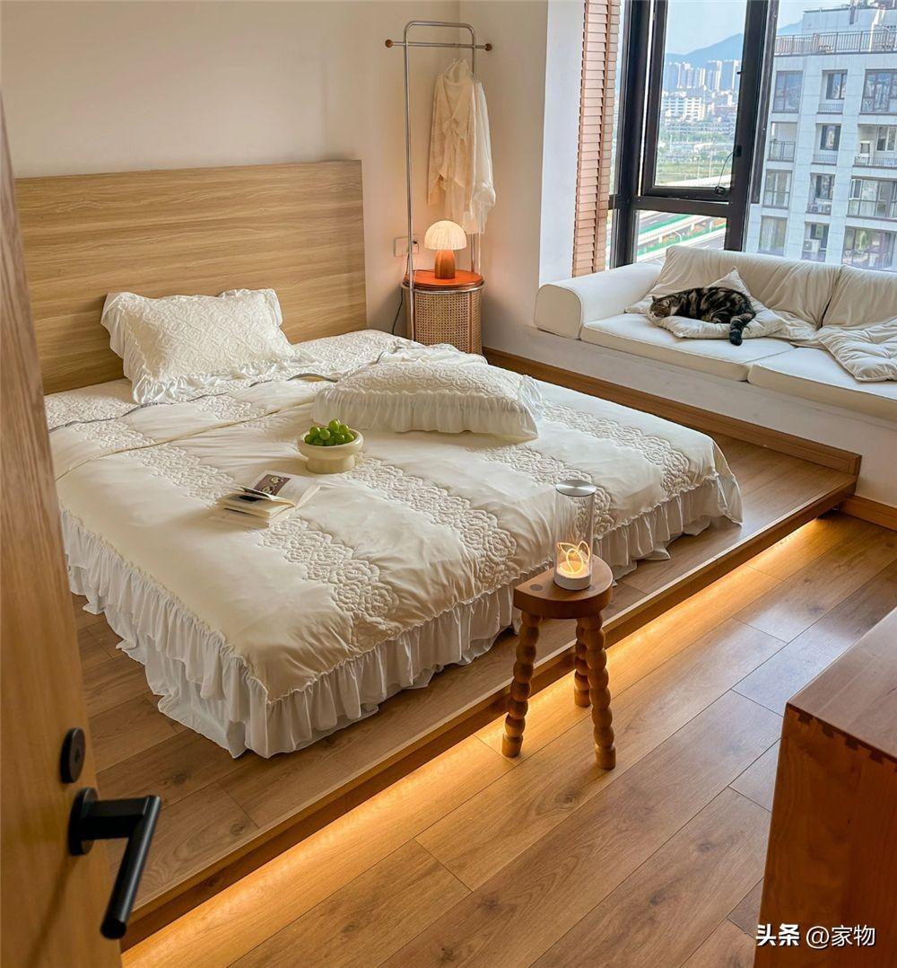 如果不想做榻榻米牀的話,其實也可以考慮地臺牀,將牀鋪連帶着牀頭櫃所在的區域同時抬高,劃分出休息睡眠的界限來,也可以在地臺處加燈帶,標記上下臺階避免絆倒。