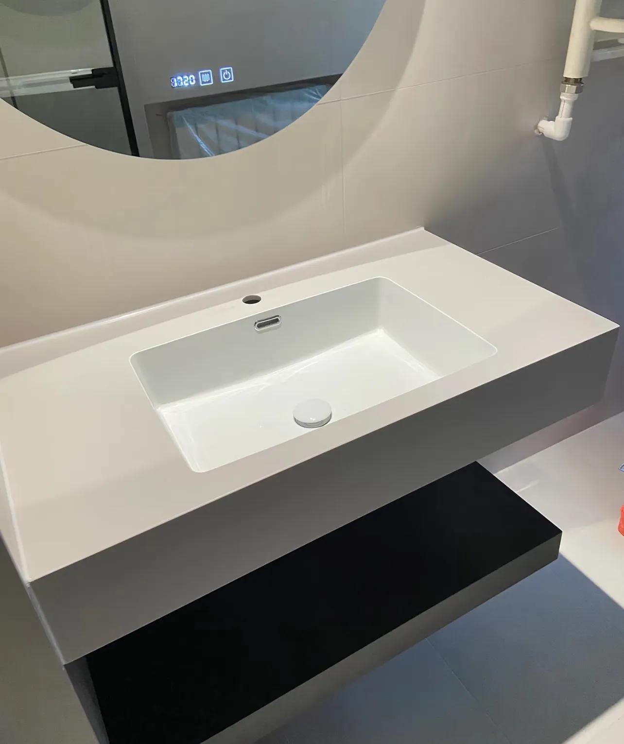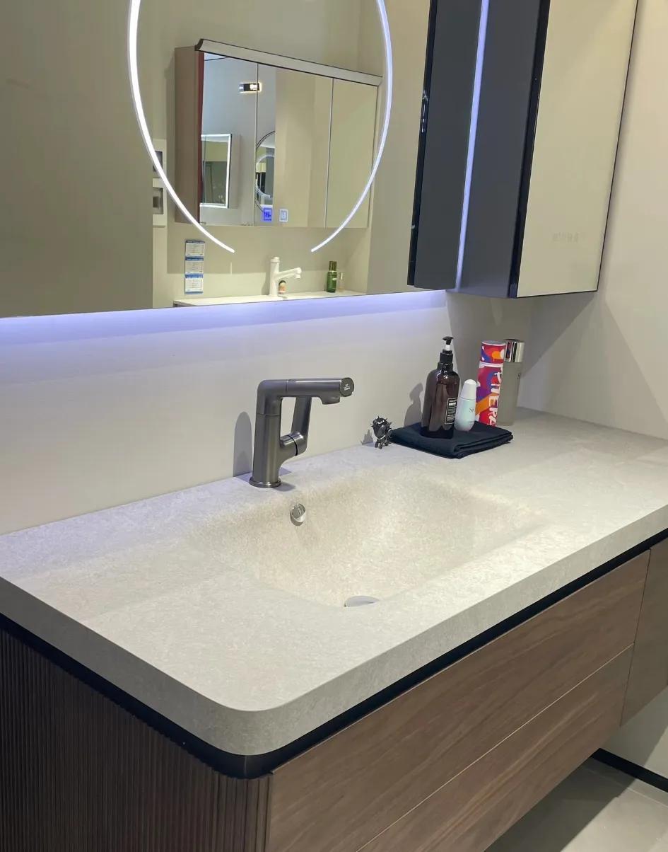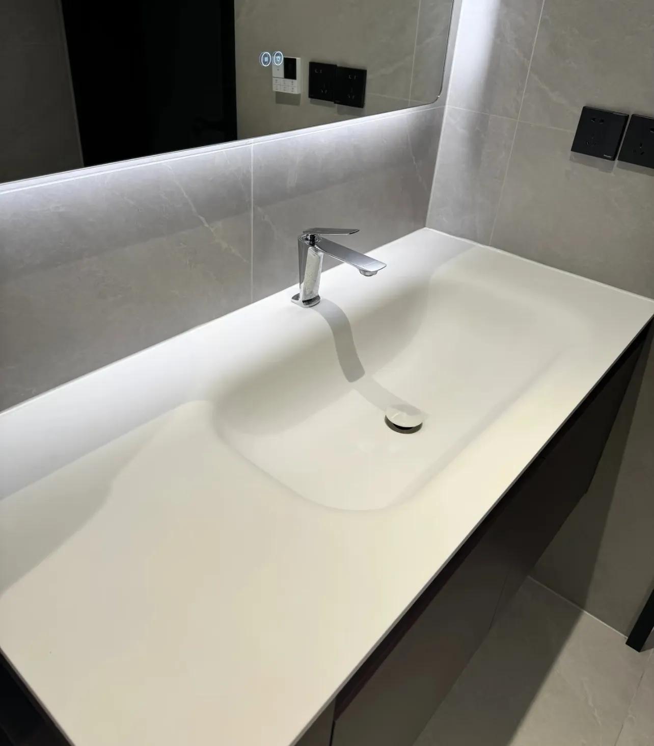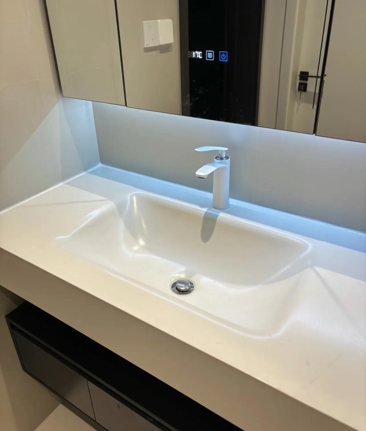 通過熱彎工藝,把整塊巖板,做成了一體的洗手盆。