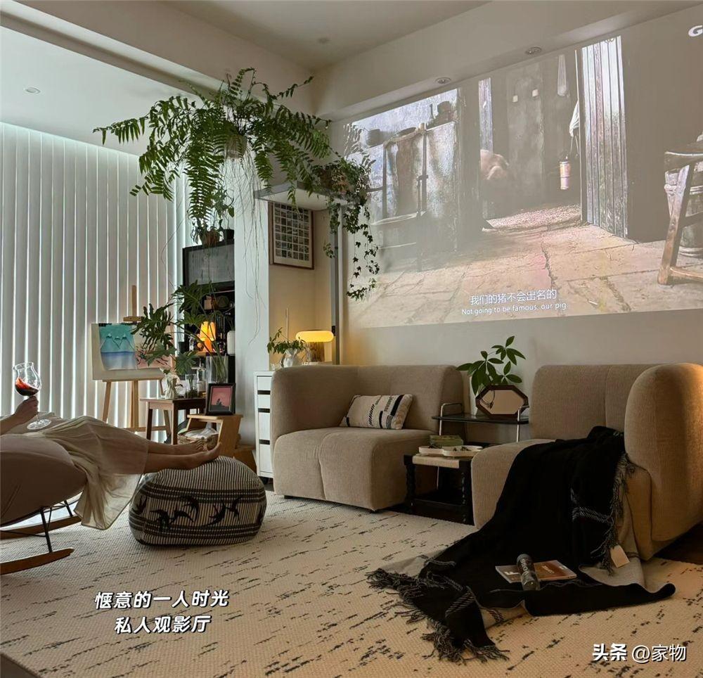 如果仔細觀察,就會發現書架上有一格放置了投影儀,可以將畫面投射到沙發後面的白牆上,搭配一張搖搖椅,追個劇,看個電影效果也絲毫不差。