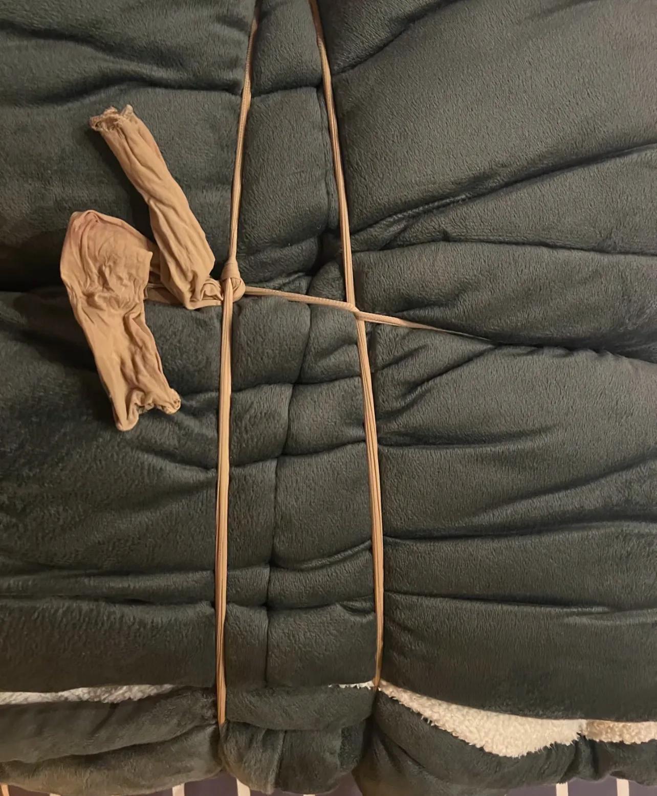 我不知道什麼時間,丟掉的絲襪,在我今年拿出來厚被子的時候,被發現用來捆厚被子。