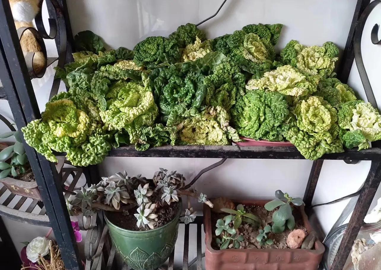 我家的白菜,會被她放在陽臺的花架上,冒充白菜花。