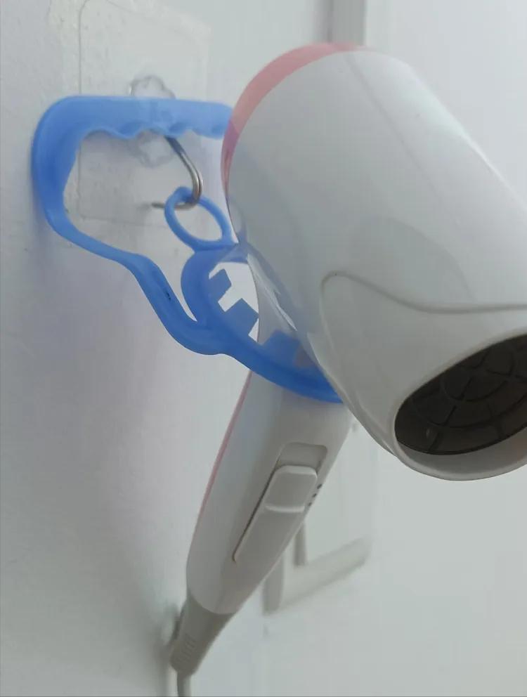 她自己自制了吹風機架,一個大桶礦泉水的提手,加上一個掛鉤,投入幾毛錢,就那麼活生生的,把吹風機,給固定在牆面上了。
