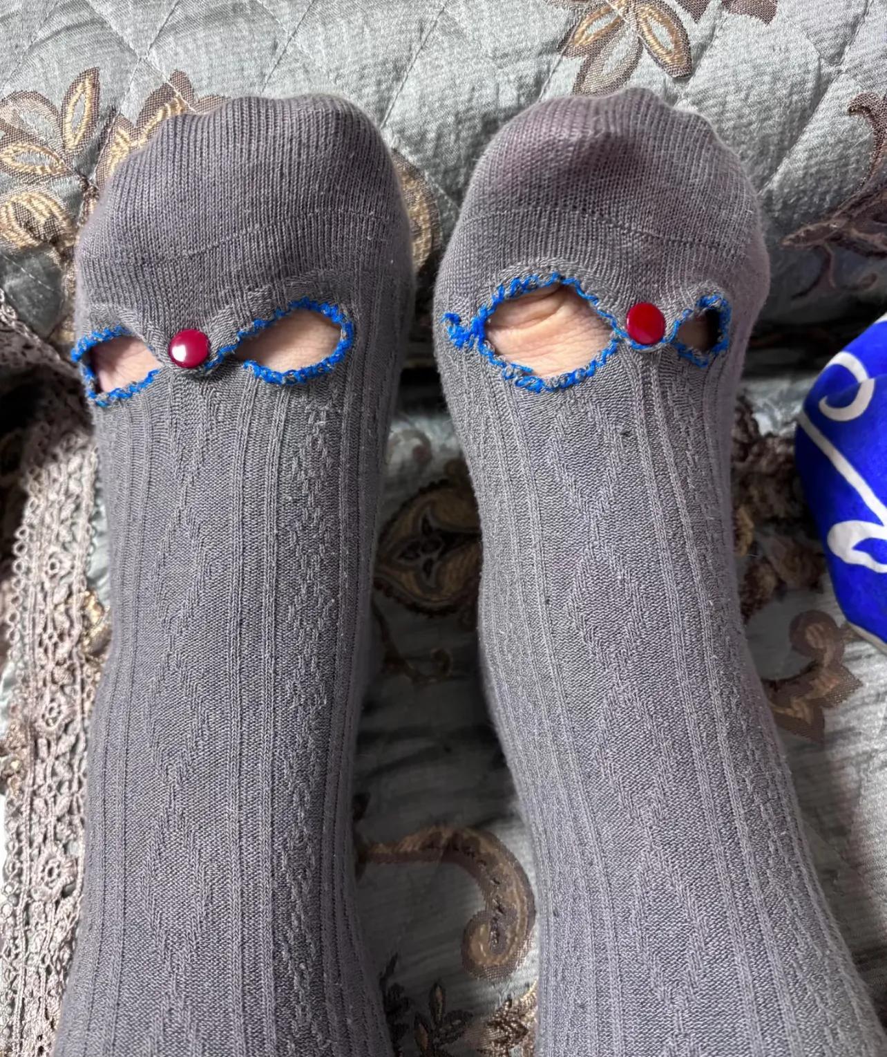 在腳背處掏了一個洞,還收了邊、做了暗釦,看着還怪可愛的。