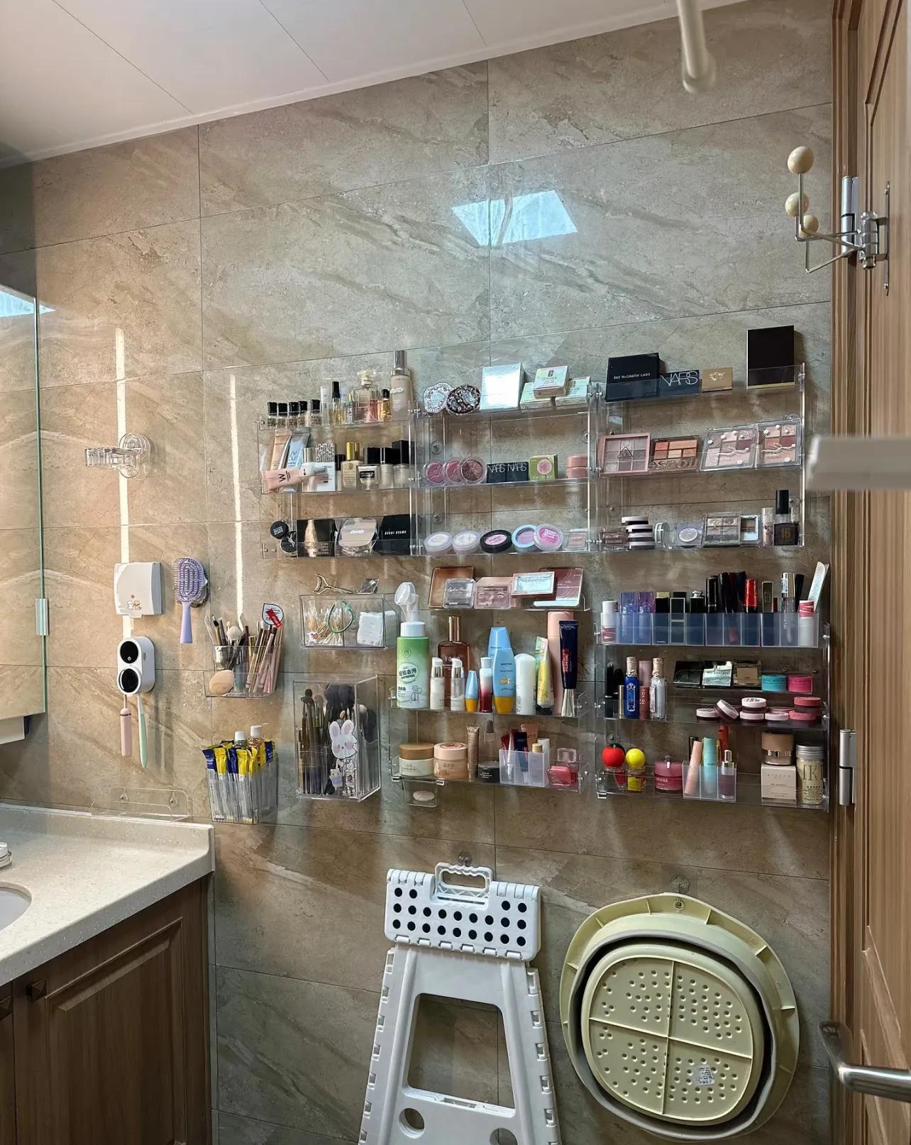 低配版是如圖,直接在衛生間牆面增加置物架,放置化妝品。