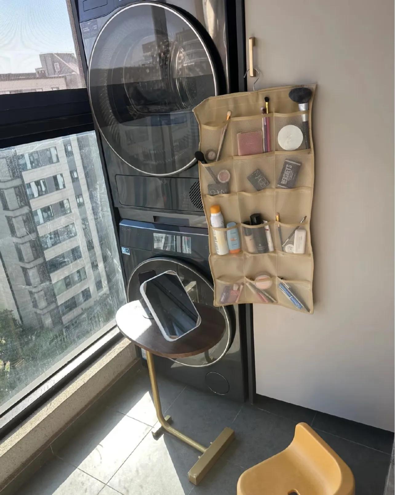 給陽臺,掛一個化妝品收納袋,再來一個小邊幾、鏡子,放點常用的化妝品,就可以在自然光下化妝,解決因光線產生的“假面”問題。