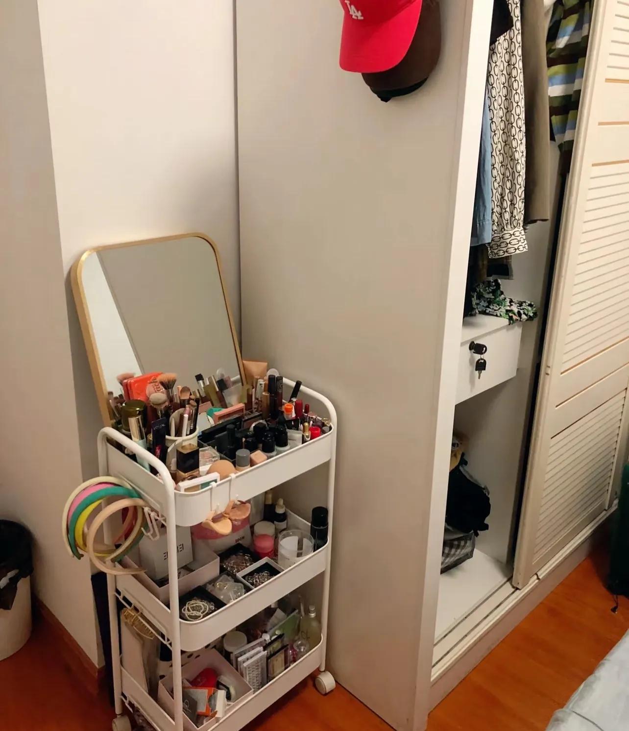 那既然,它化妝又不方便、收納還不太行,還佔地方,不如我們將之扔掉,嘗試用其他方案,去替代化妝桌的,化妝、化妝品收納功能。