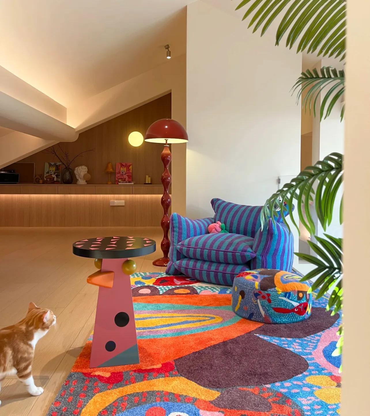 上圖就是最好的例子,地毯作爲主色統領,未來搭配只要圍繞着這個統領,不管是大到燈具,還是小到桌面擺件,但凡能呼應上的,出來都是協調美觀的。