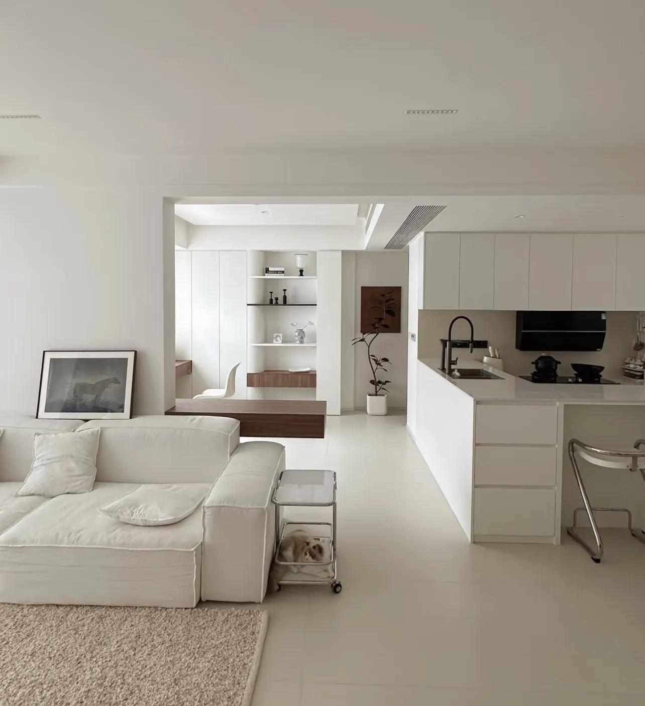 比如上面的純白色的家,看着是很乾淨,但是拿回家的東西、隨手脫掉的衣服,不管是放桌上還是放沙發上、搭在餐桌靠背上,第一時間會被凸顯出來,顯得很亂;