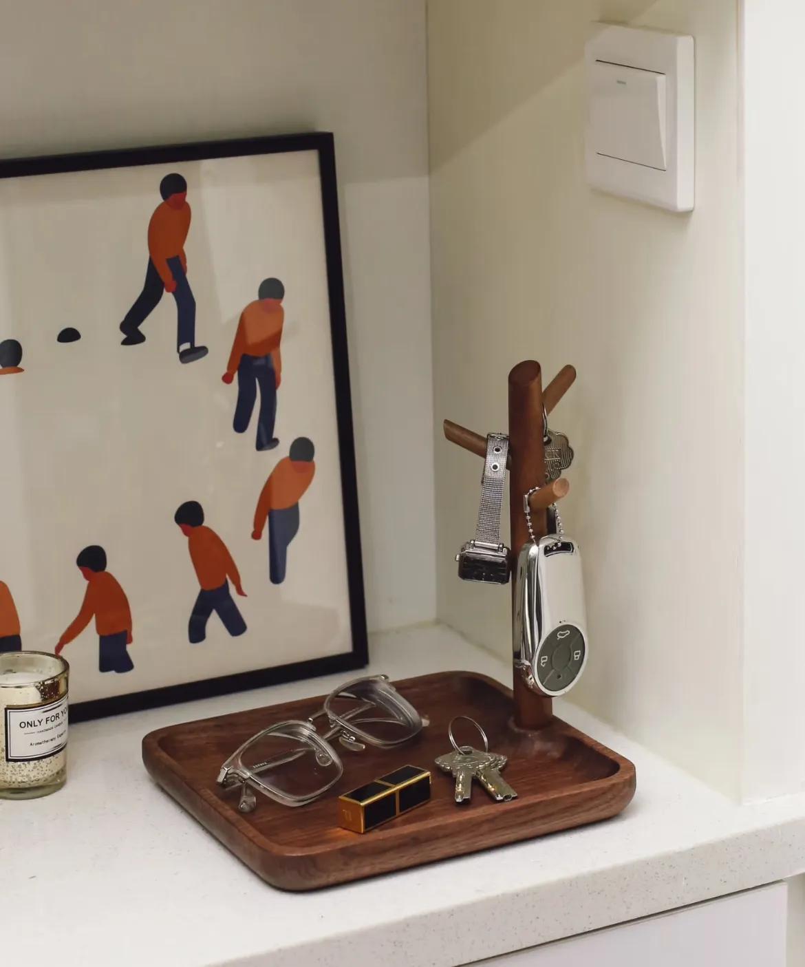 比如,玄關、茶几的托盤,它就是用來放鑰匙等各種小零碎的,理應是亂的區域,但又用一樣東西把這些小零碎聚攏到一起,讓它們有了收納感。