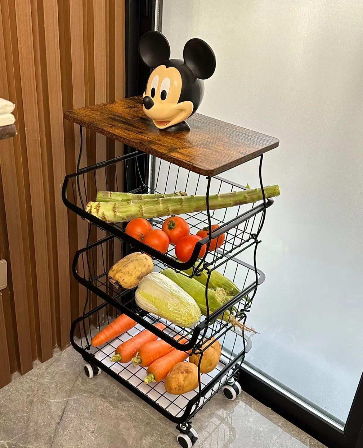 還有廚房的蔬菜架,相比雜亂無章的扔放,它改變的不止是歸攏,而且還順便進行了分層分類,任何水果蔬菜隨便一放,看着都像是超市裏經過精心整理的貨品展示架。