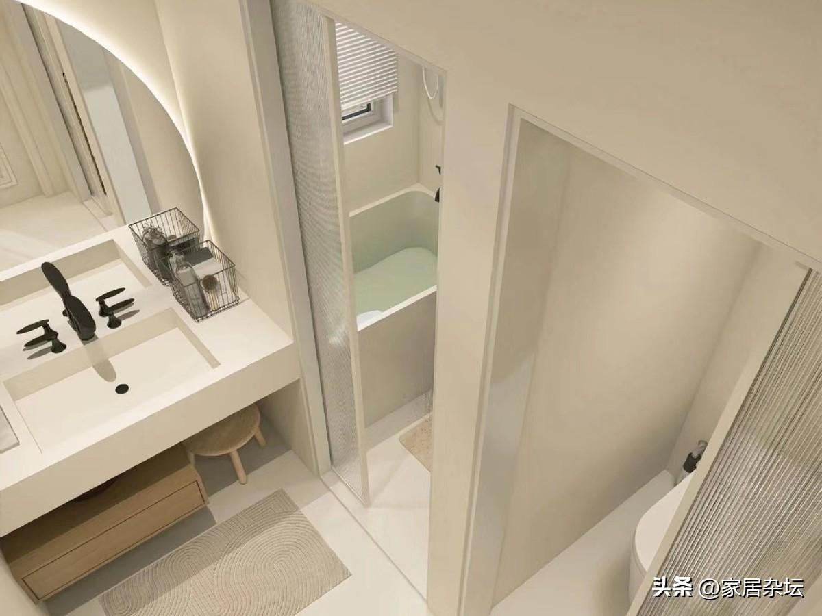 這種方案,只要衛生間滿足兩三平米,都可以實現。可以讓我們的衛生間使用功能更合理,而且顯得更寬敞,不會有擁擠感。