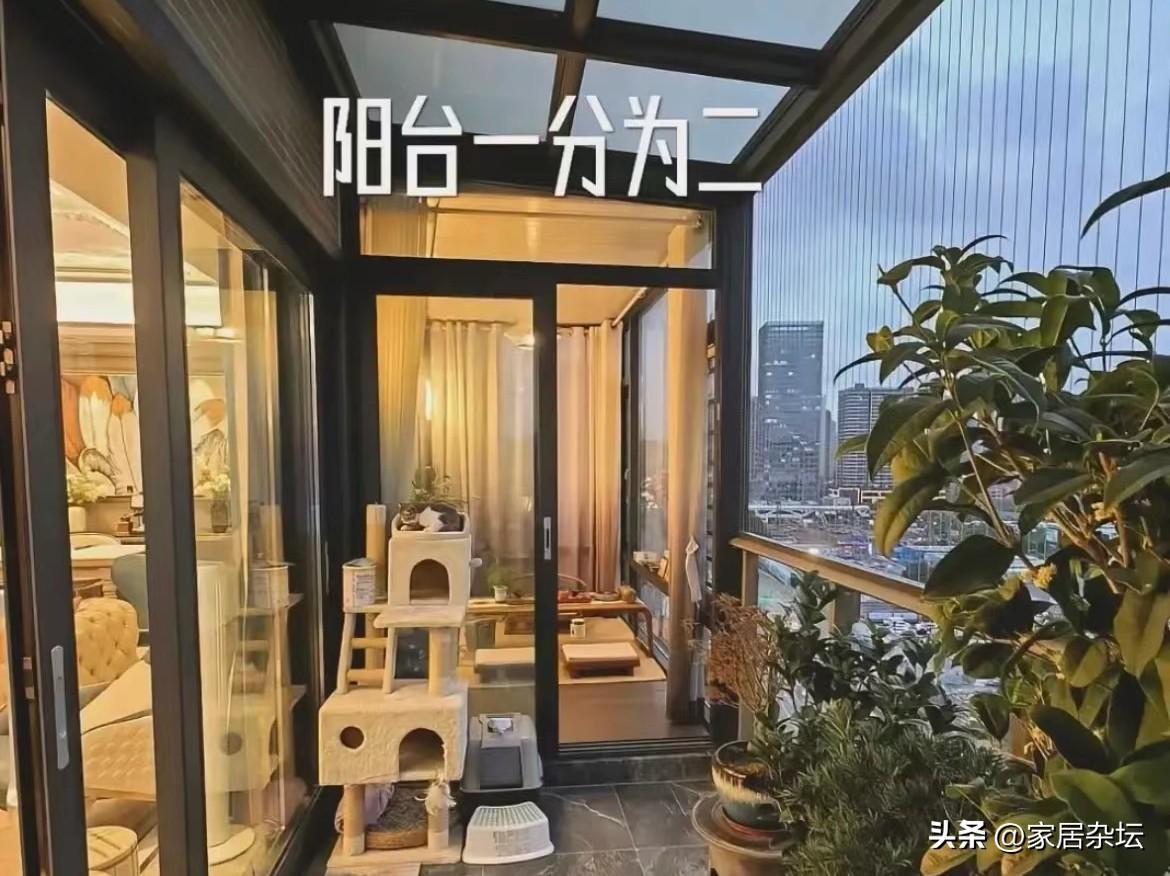 這種做法的本質,就是將陽臺一分爲二。但是,有個前提,就是陽臺要夠大,一般陽臺的橫向要達到5米以上。太小了,一分爲二就不太好用。