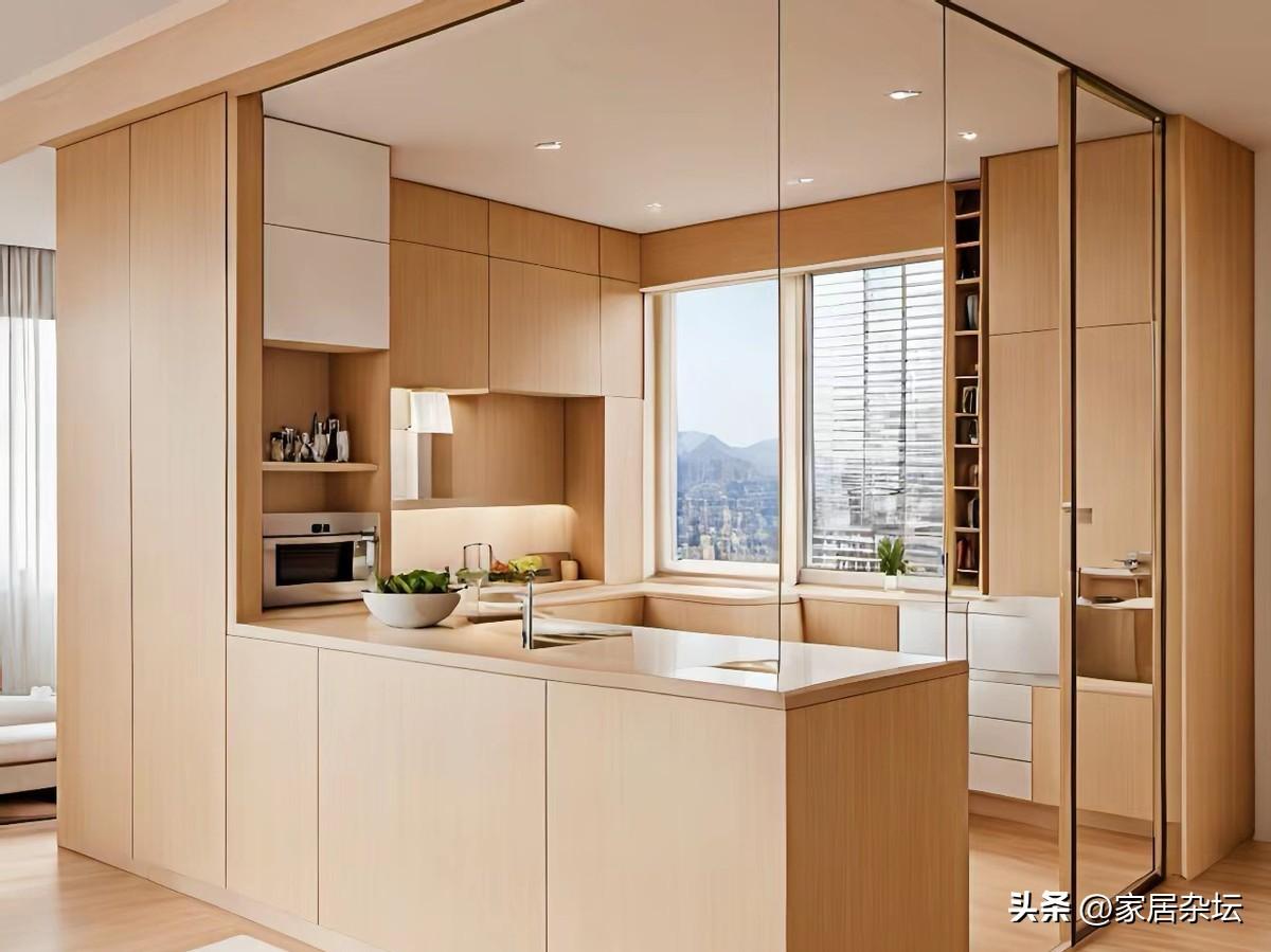 ①、裝修佈局時,提前將廚房一面牆拆除。把廚房兩面牆做成玻璃牆,都可以使用推拉門代替。