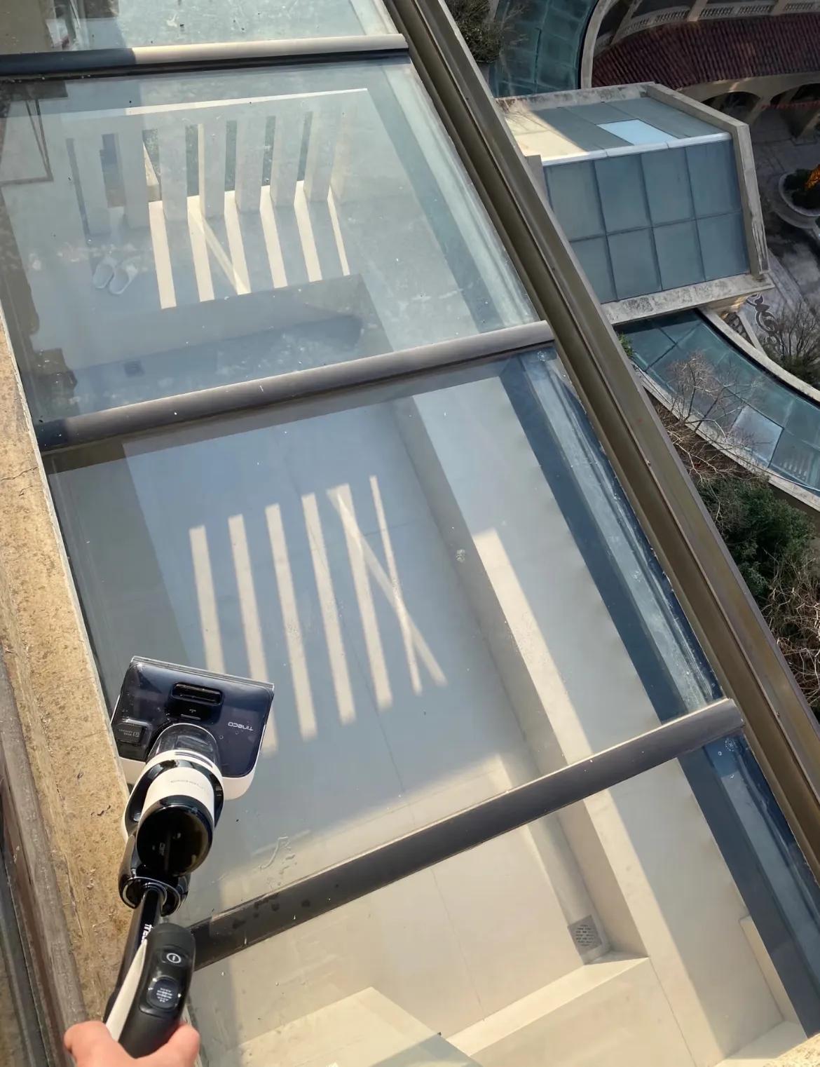 結果這不試不要緊,一試又給洗地機增加了新技能,無論是雨棚玻璃、還是窗戶上的玻璃,你還別說,它各個給你清潔的乾乾淨淨。